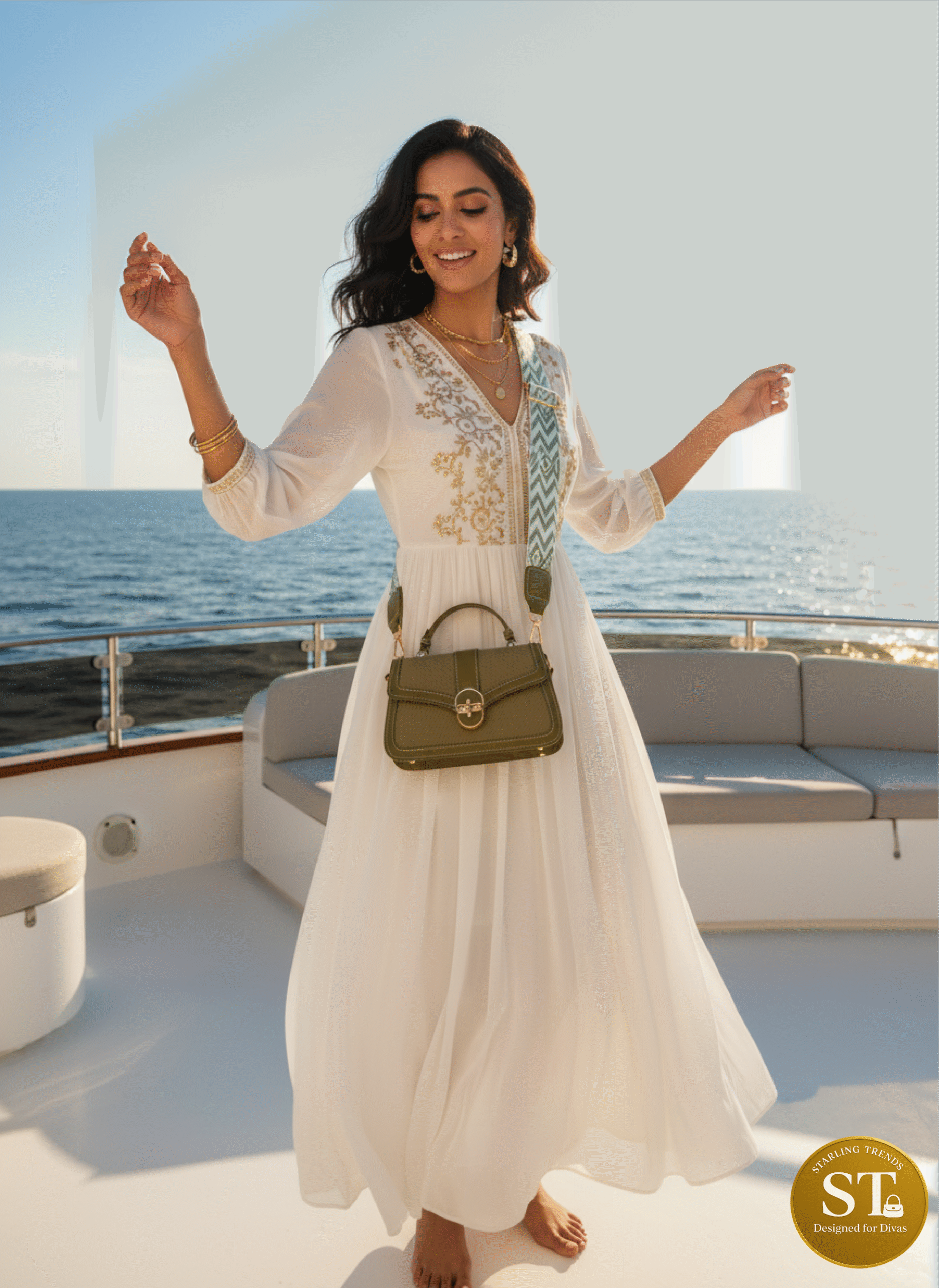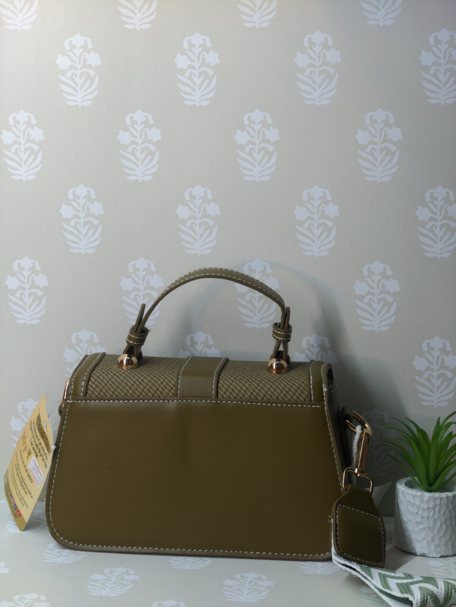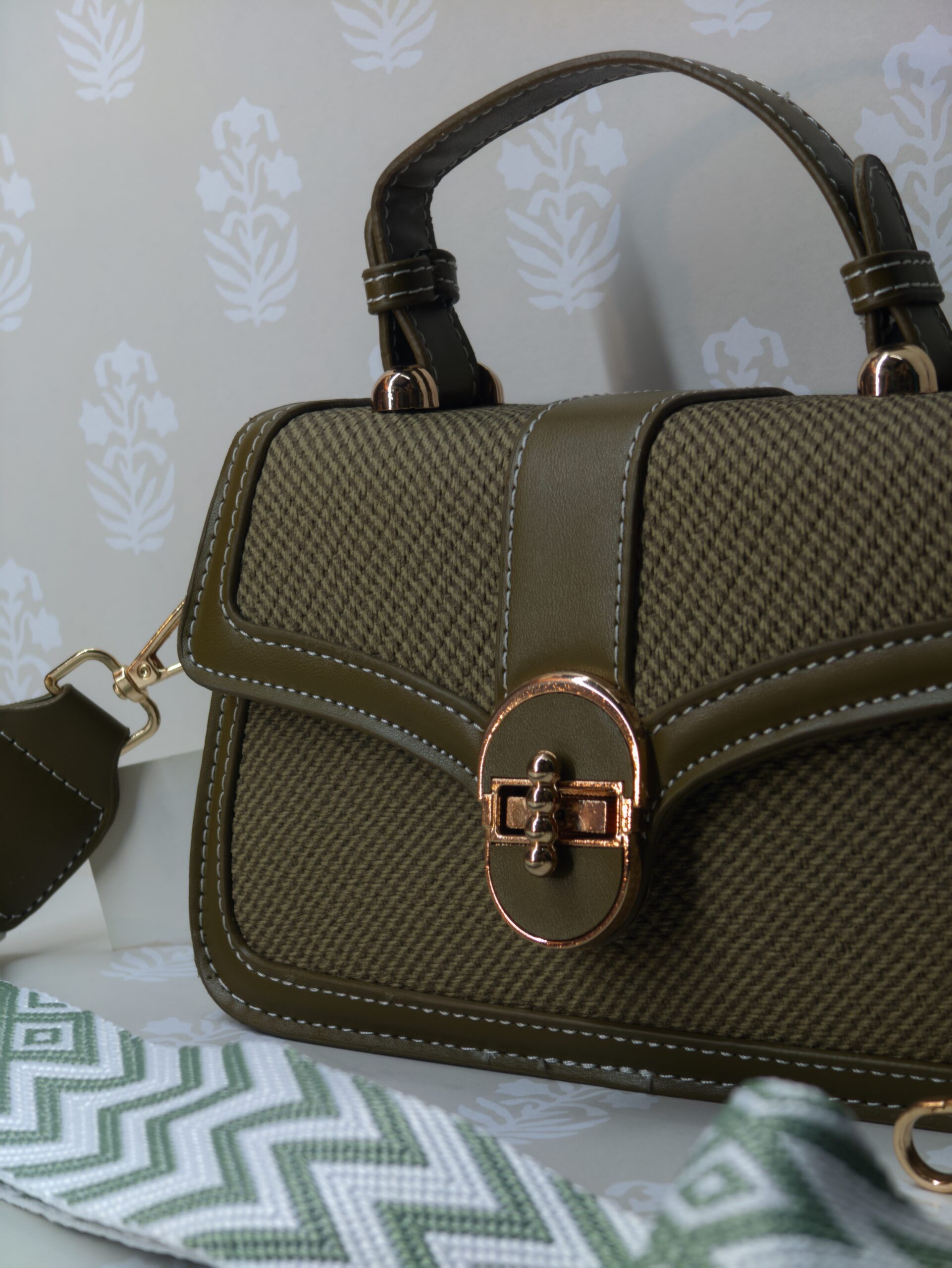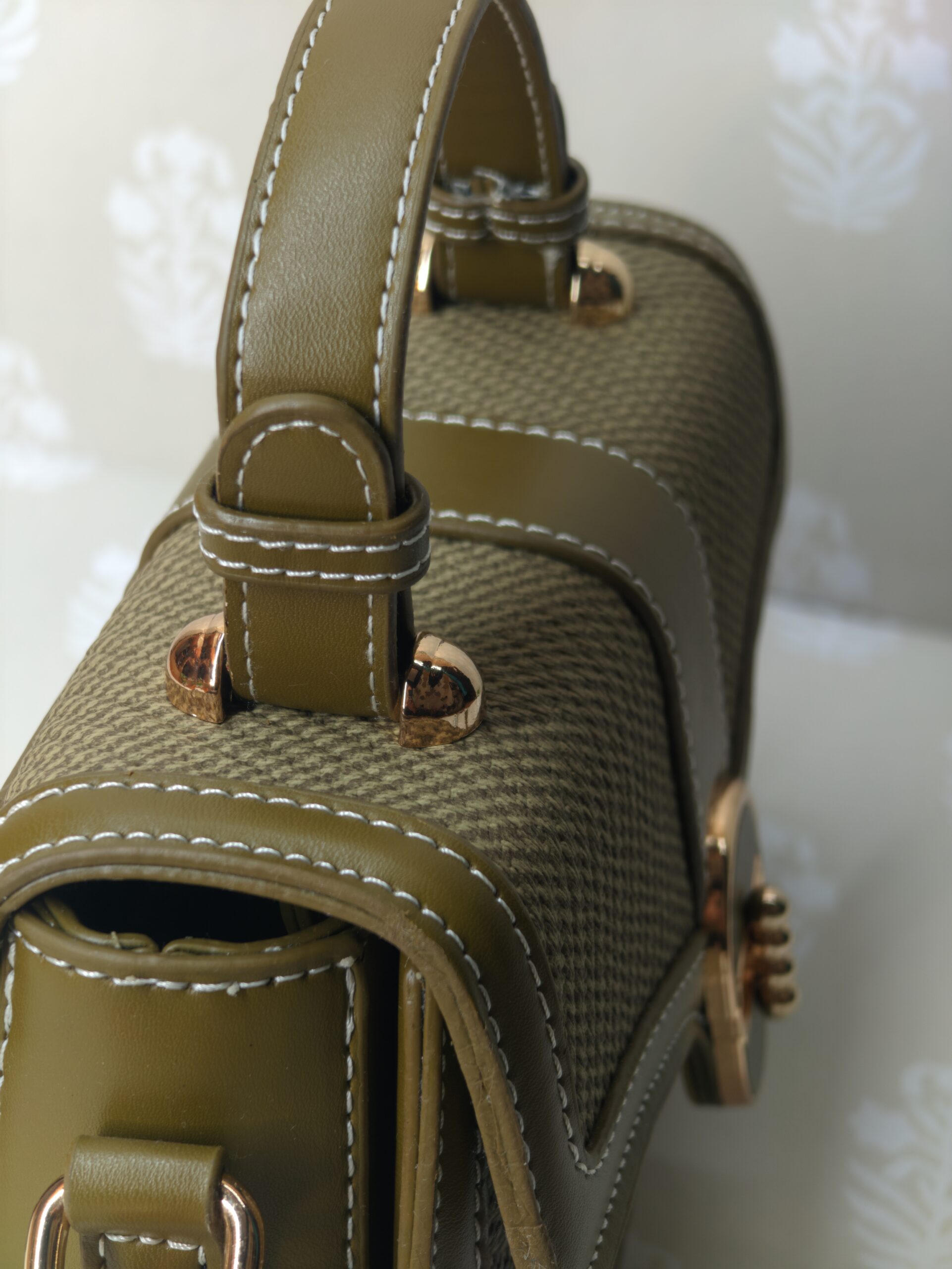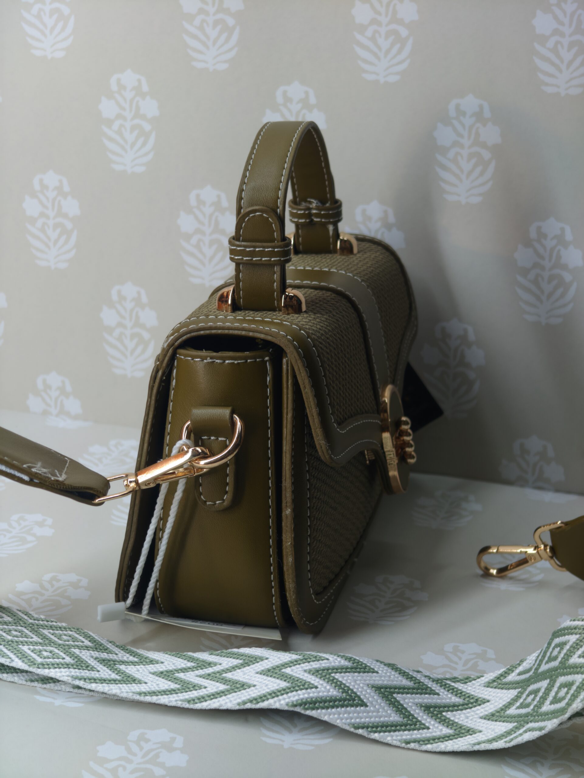 A chic olive green sling with a textured finish and structured silhouette. Gold hardware and a chevron-striped strap add bold contrast, while the top handle offers styling versatility. Compact yet refined, it’s a statement piece for both casual and polished looks.