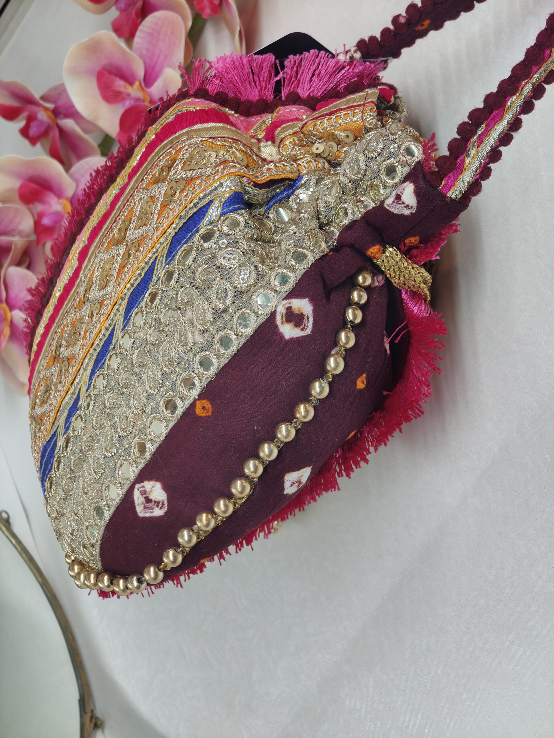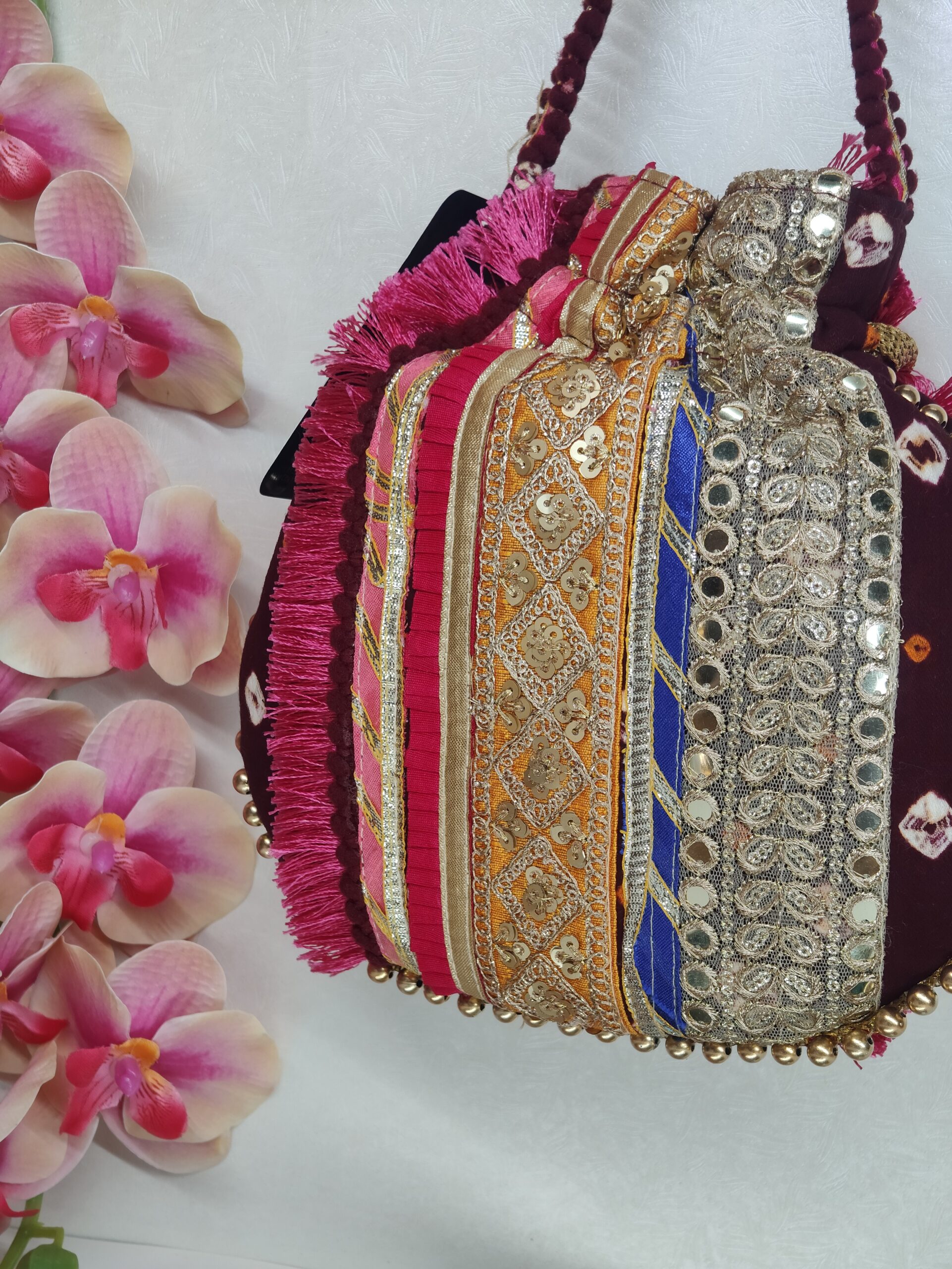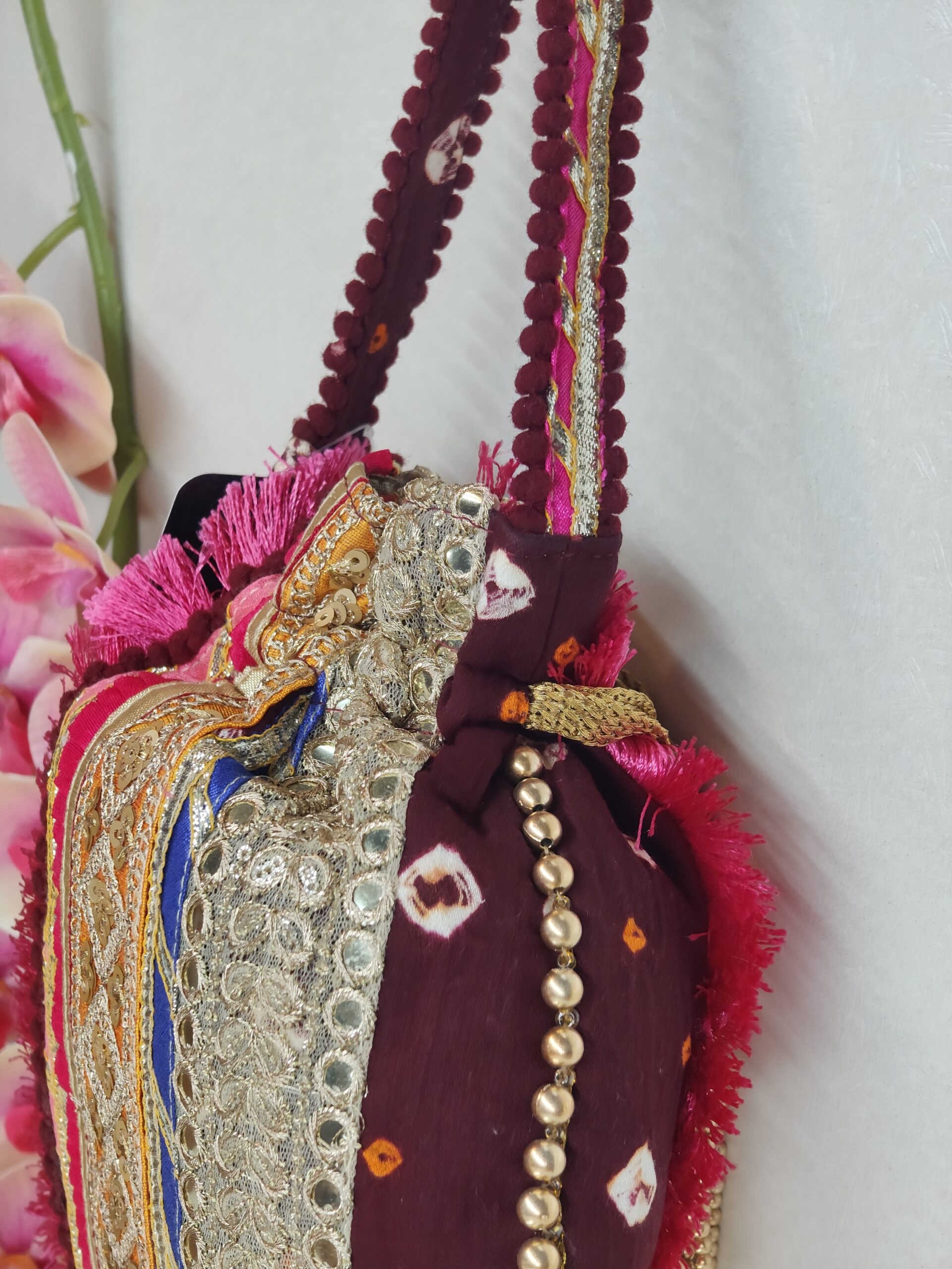 A regal velvet sling bag adorned with vibrant gota strips, sequins, and zari work. Its rich maroon base and jewel-toned embellishments evoke festive grandeur, perfect for weddings or cultural soirées. A handcrafted statement piece that blends tradition with bold elegance.