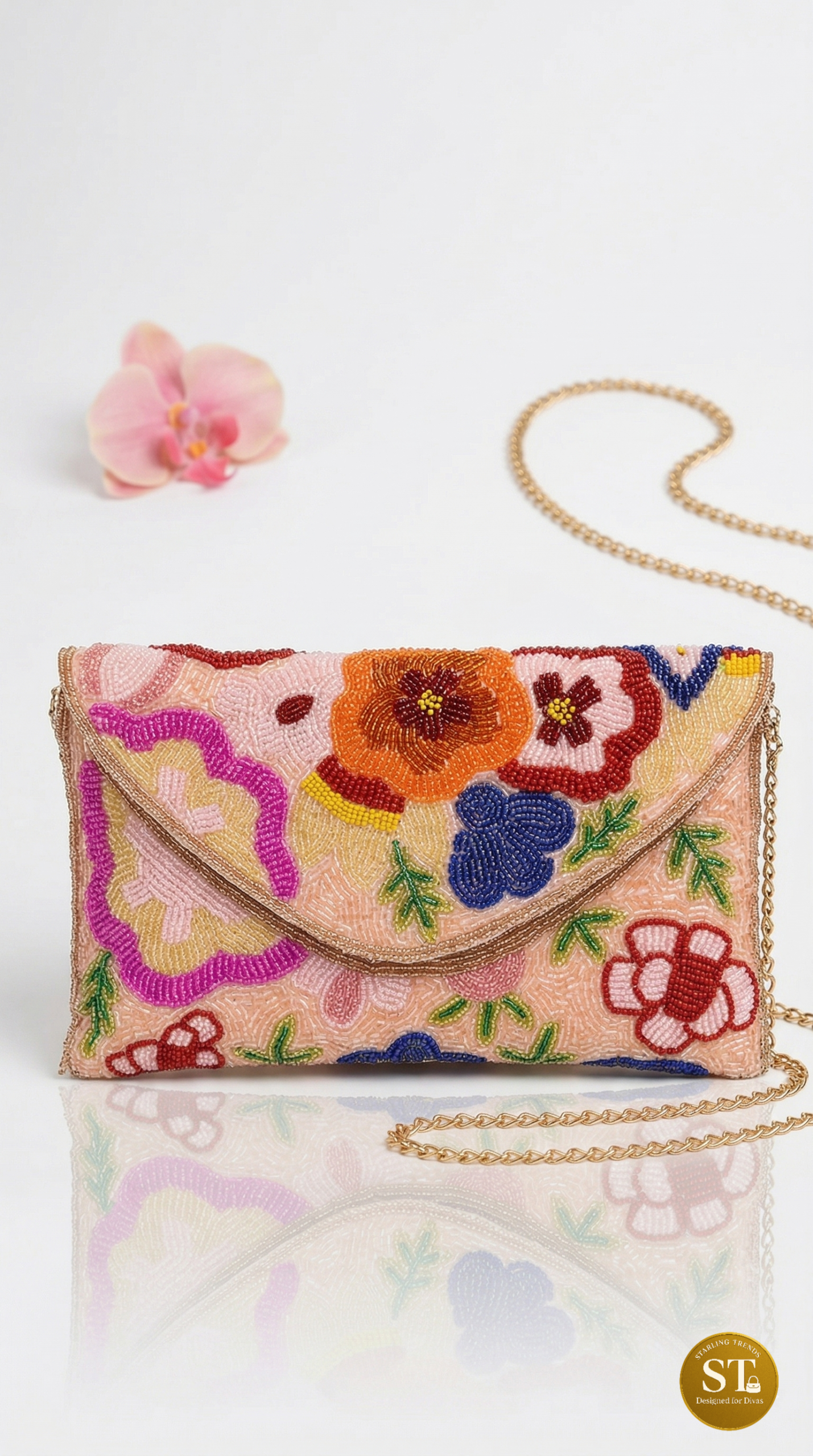 🎨 Color Palette: Multicolor beadwork—orange, red, pink, purple, green, blue—on a blush-toned base