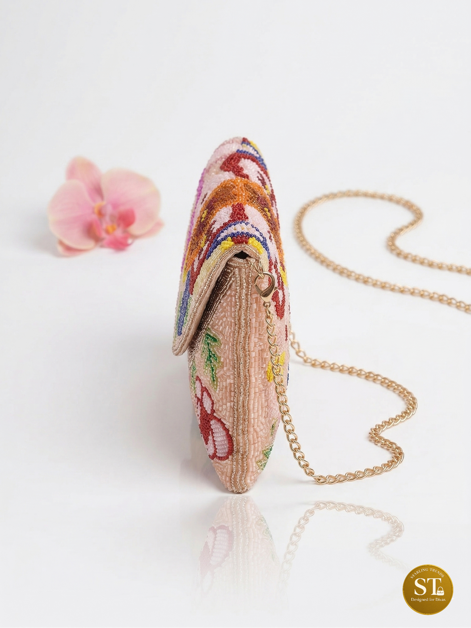 A radiant crescent-shaped sling bag, hand-embroidered with vibrant floral beadwork in hues of orange, pink, purple, and green. Paired with a sleek metallic chain, it’s a celebration of craftsmanship and color—perfect for festive evenings or statement styling.