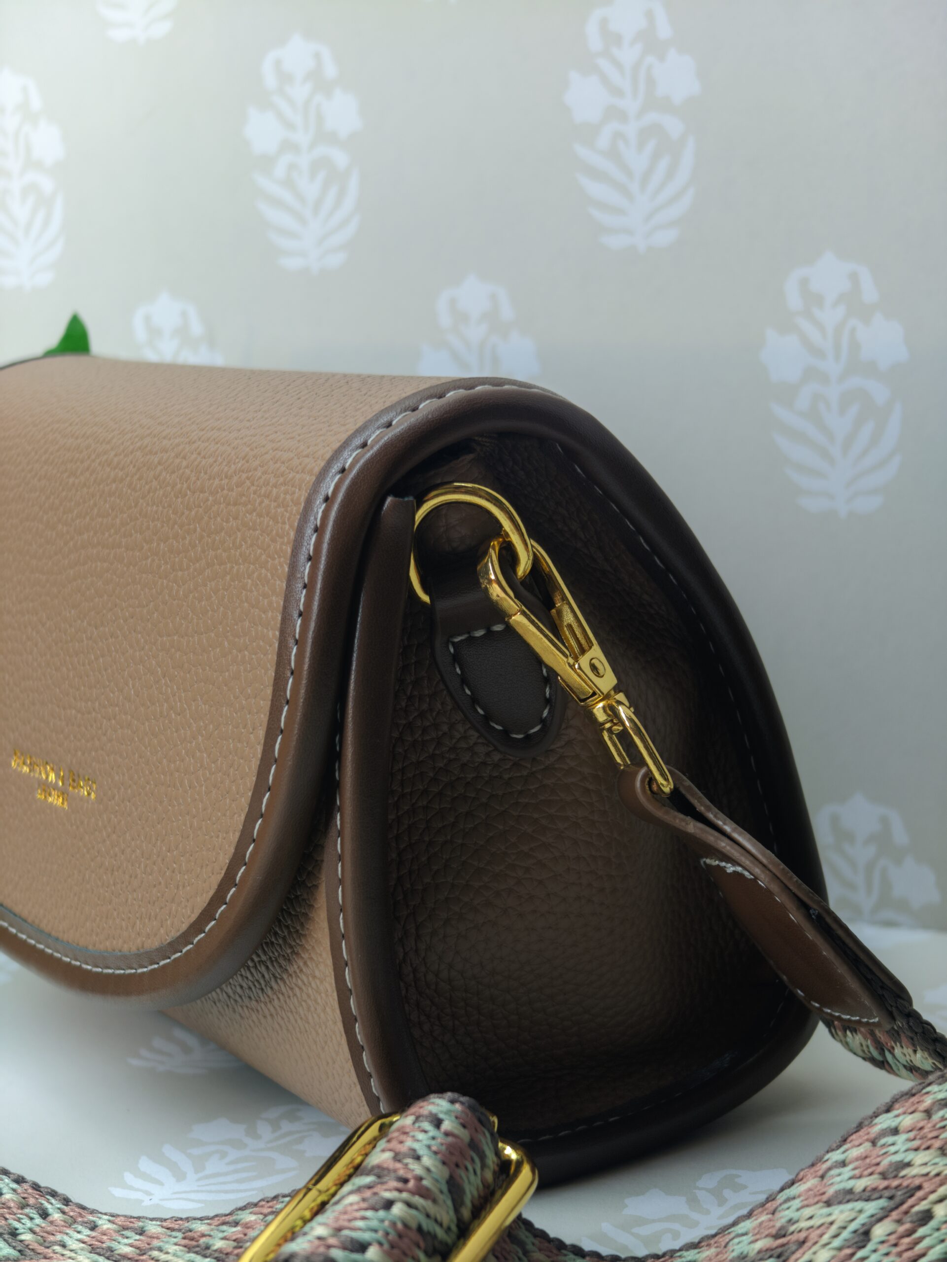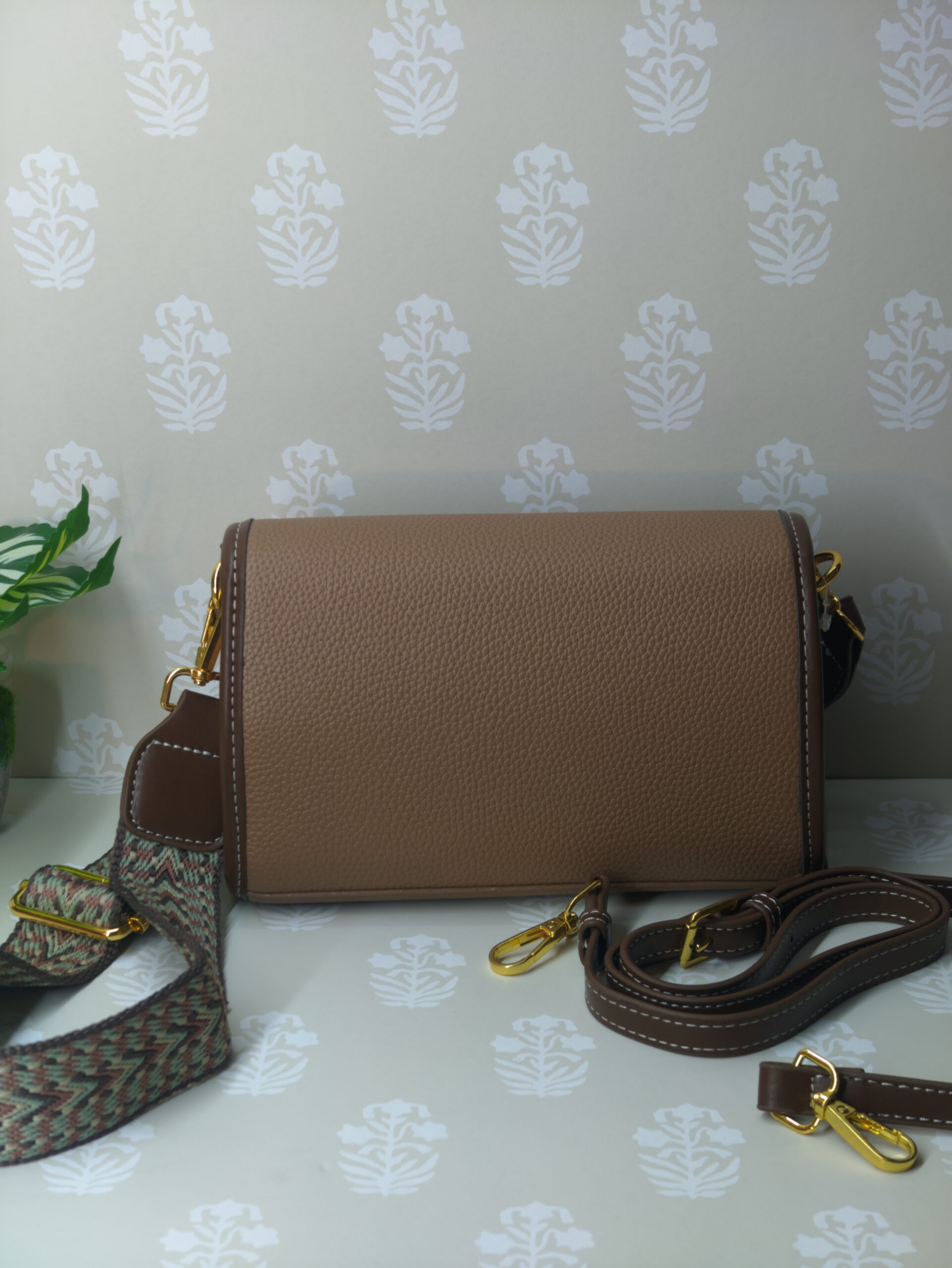 A rich brown leather sling bag with a structured flap silhouette, gold hardware, and a striking multicolor woven strap. Its textured finish and compact elegance make it perfect for both daywear and refined outings.