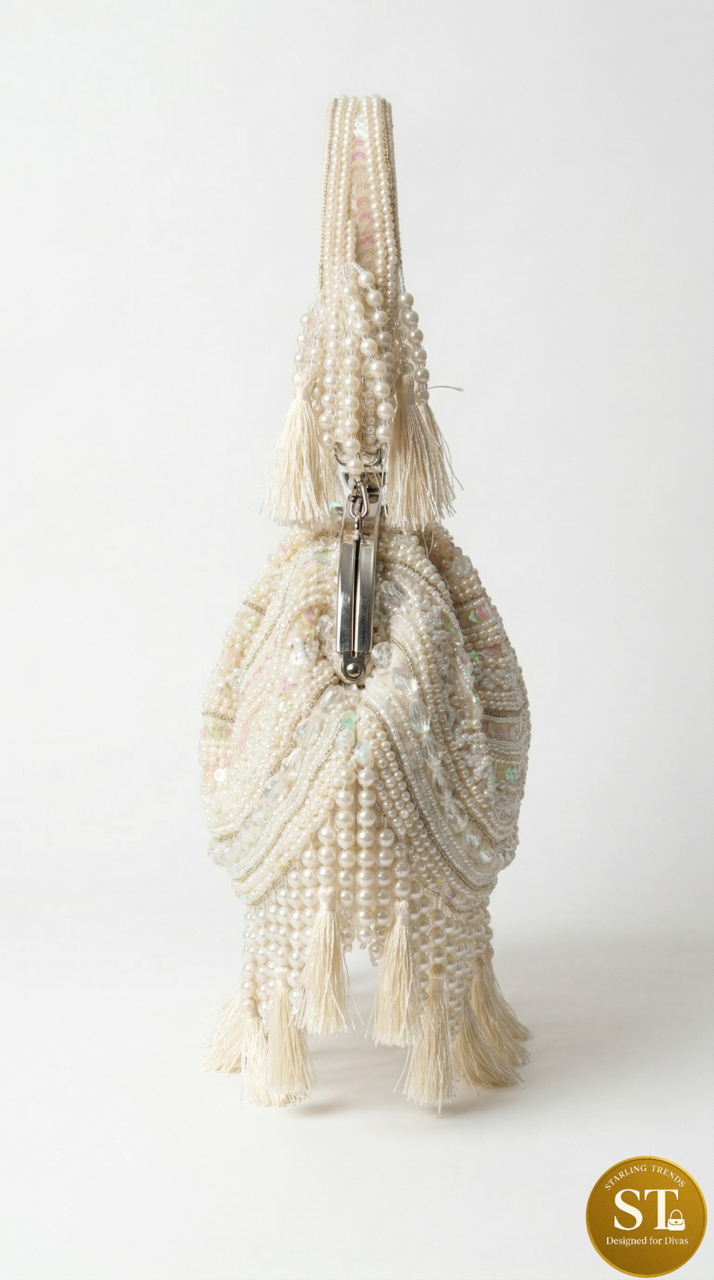 A regal crescent-shaped potli in ivory, lavishly hand-embellished with pearls, sequins, and tassels. Perfect for weddings and festive soirées, it blends vintage opulence with modern finesse.