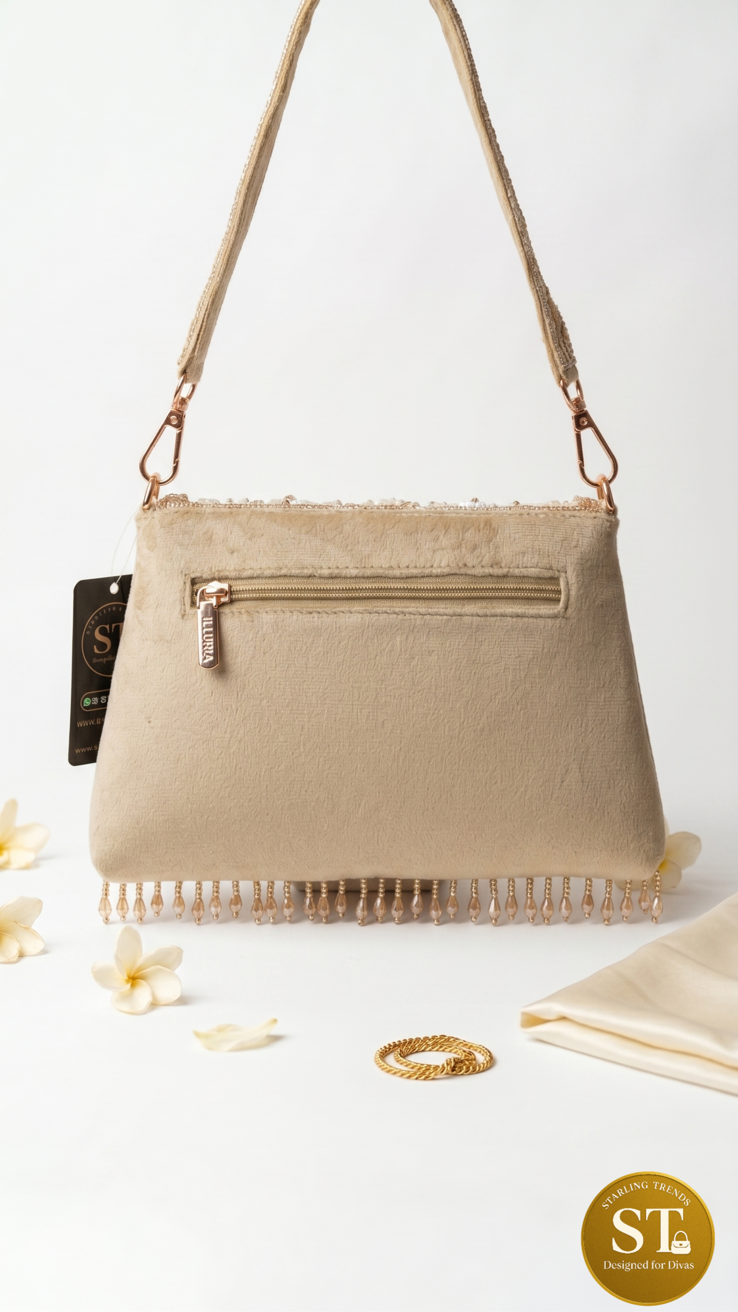 Elegant cream-gold clutch adorned with intricate floral beadwork and subtle shimmer. Features a sleek flap design with delicate tassel fringes and a soft velvet back with zipper pocket. Comes with a slim shoulder sling, perfect for festive and wedding occasions.