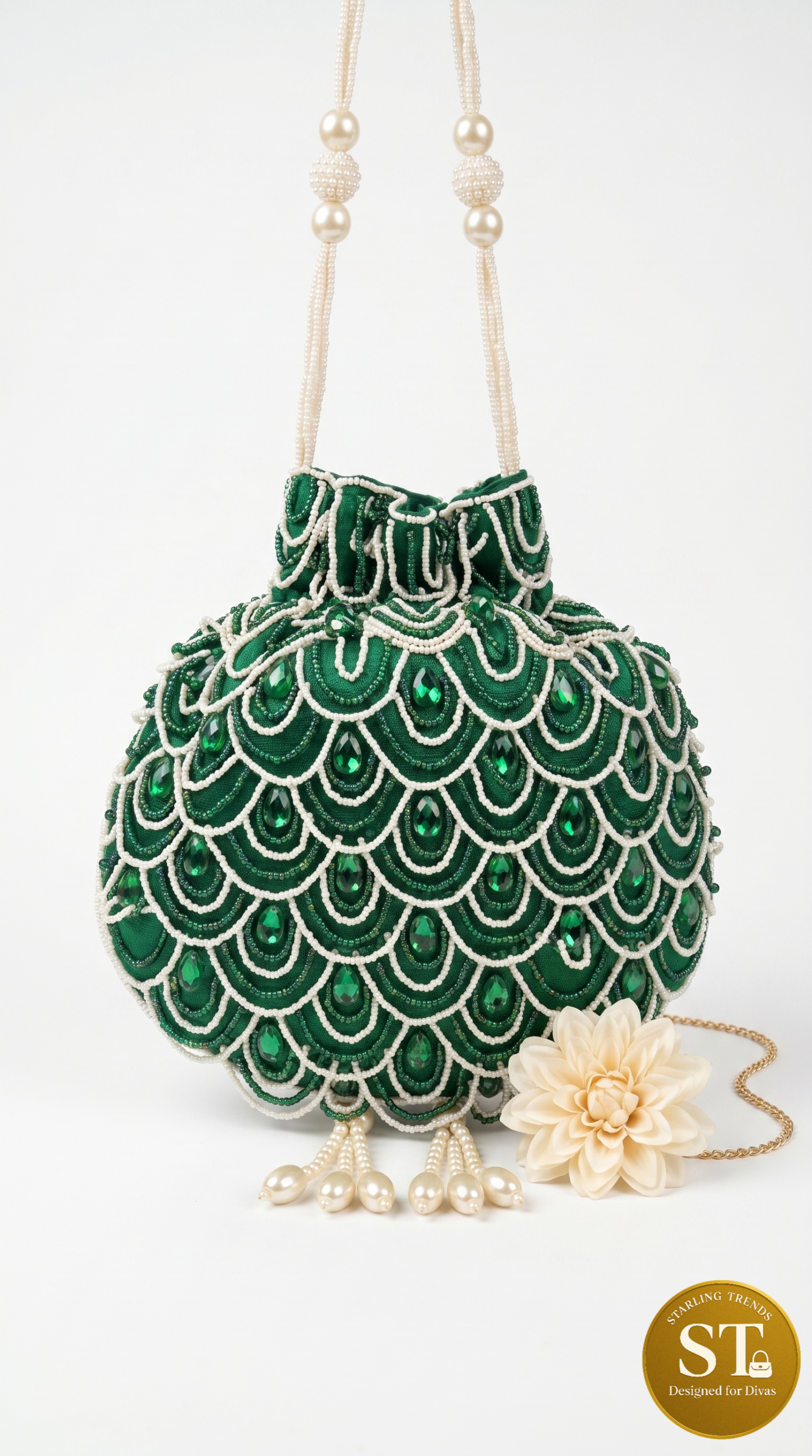 A stunning handcrafted clutch adorned with intricate floral embellishments, shimmering sequins, and delicate beadwork. The detachable strap with pearl tassels adds versatility, making it perfect for evening events, weddings, or special occasions.