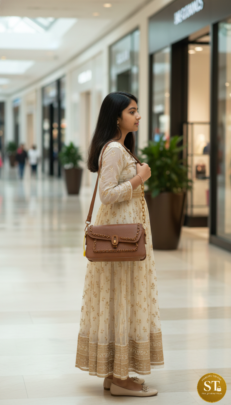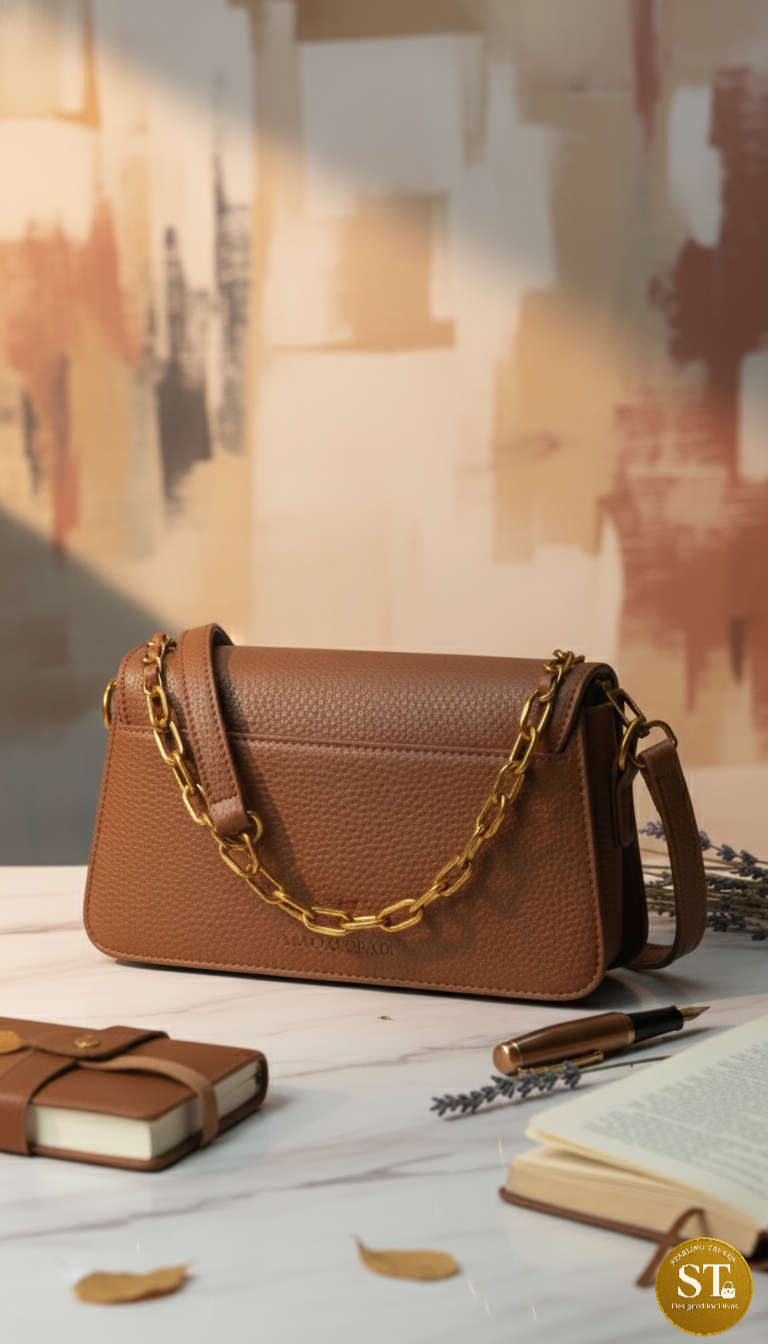 Elegant taupe sling bag crafted in textured faux leather with gold-tone chain detailing. The structured flap design adds a classy touch, while the dual sling offers versatile styling—perfect for everyday outings or evening looks.