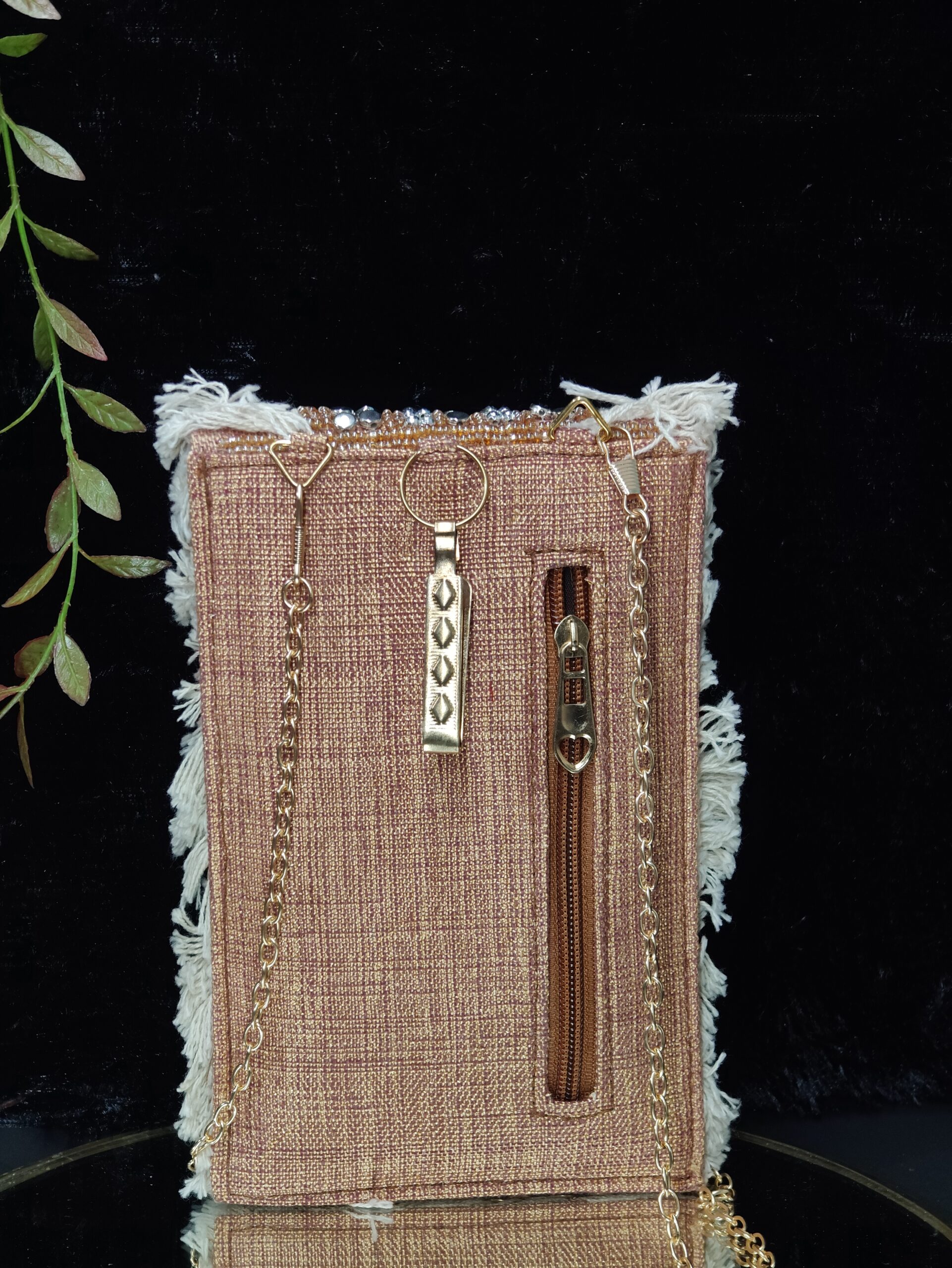 This stunning handcrafted phone sling showcases intricate bead, sequin, and pearl embellishments with layered textured detailing. Designed for festive occasions, it features a back zip pocket and a detachable metal chain sling for a chic and functional finish.