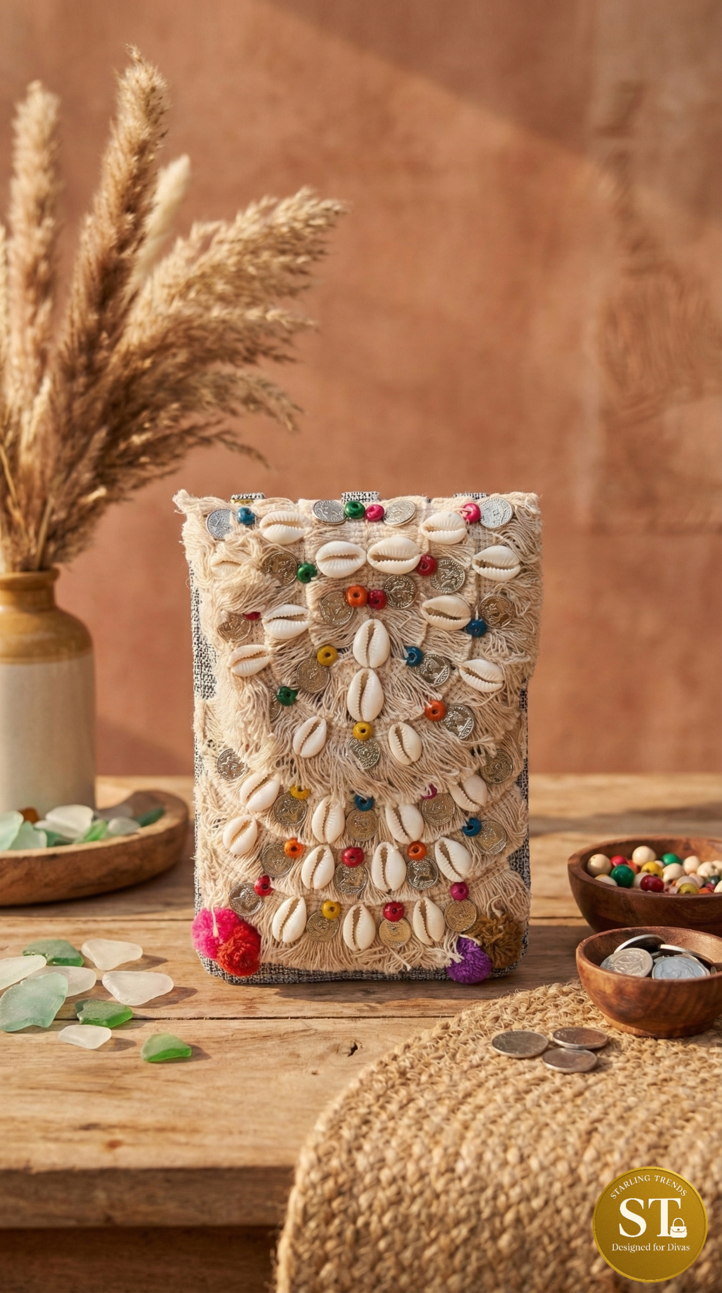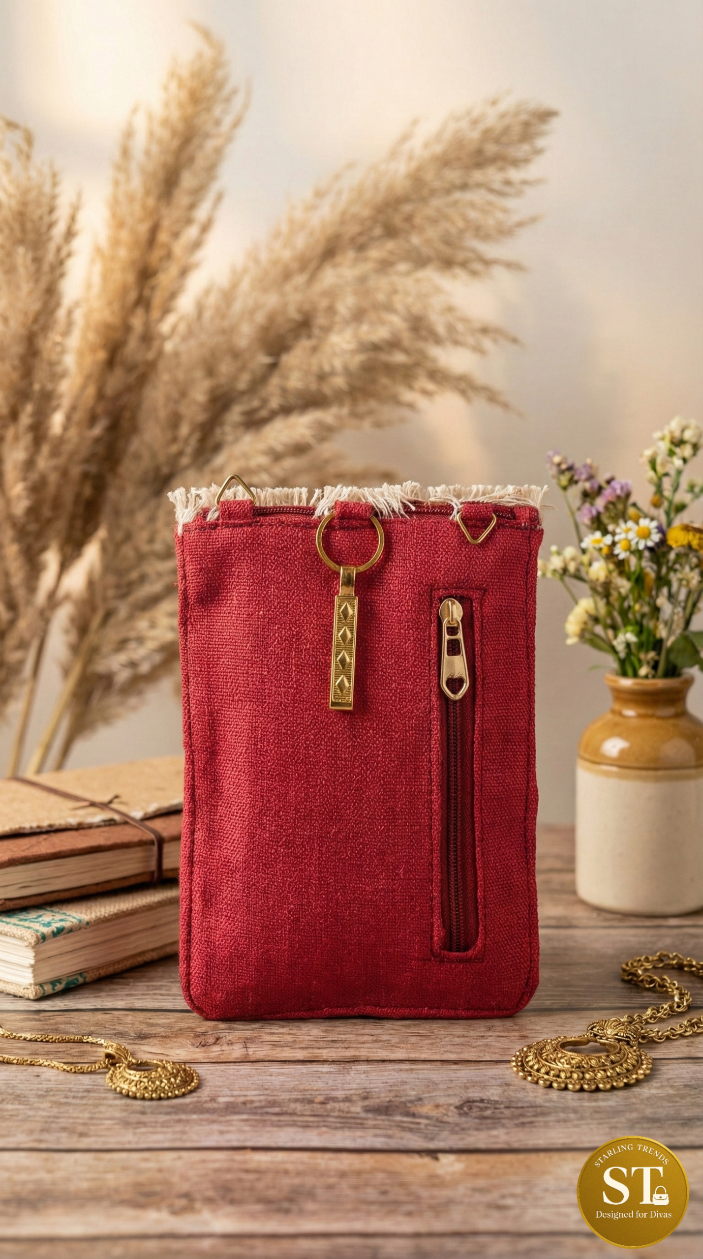 A handcrafted phone sling designed for everyday ease. Featuring detailed handwork on the front and a functional back pocket, this piece blends style with utility—perfect for hands-free outings, travel, or casual days.