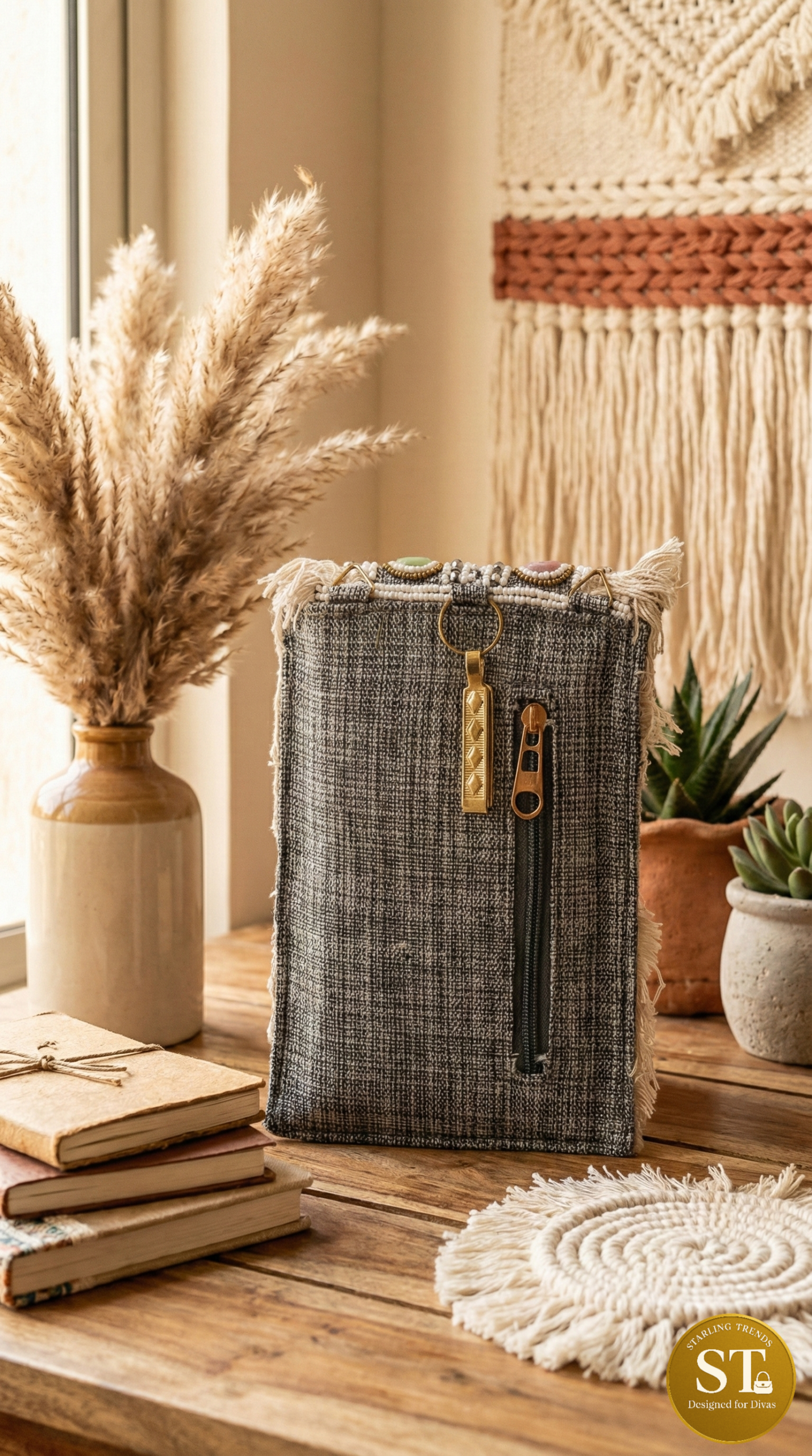 A handcrafted phone sling designed for everyday ease. Featuring detailed handwork on the front and a functional back pocket, this piece blends style with utility—perfect for hands-free outings, travel, or casual days.