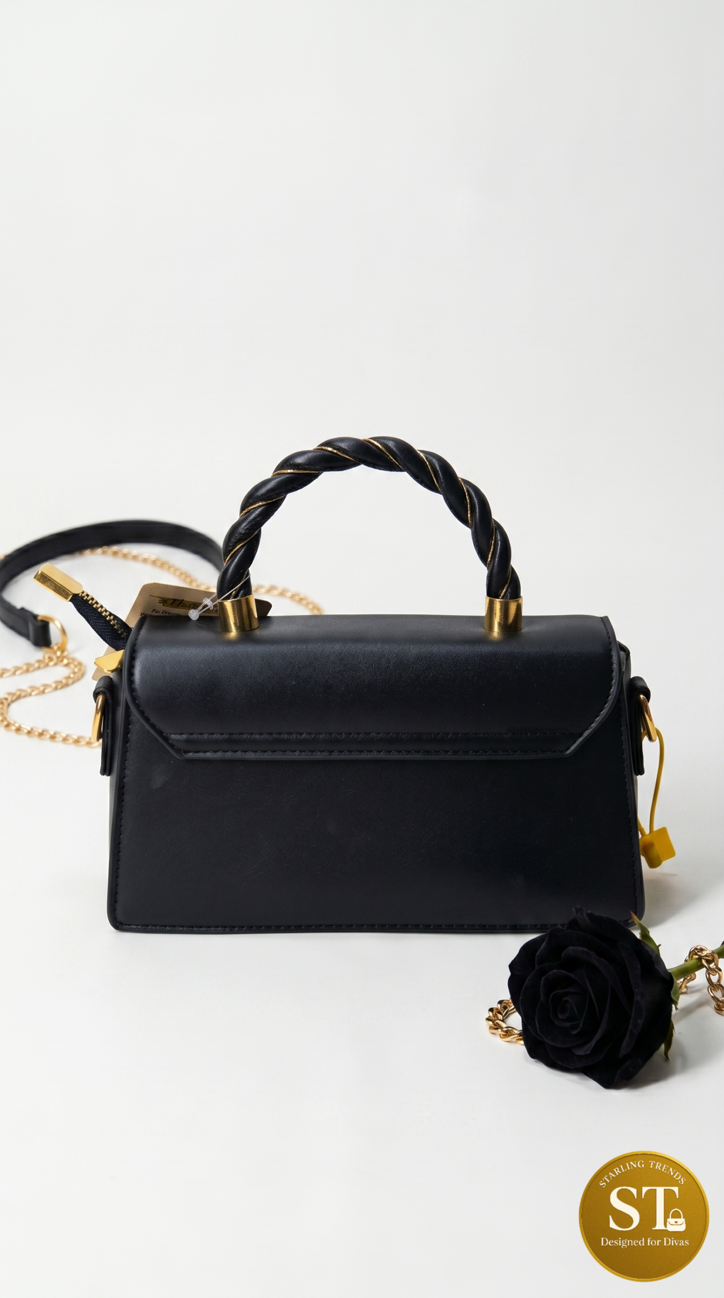 A sleek black structured handbag with a premium woven-texture front and smooth back. Features a stylish twisted top handle with gold accents and a rotating lock closure. Compact yet classy—perfect for both casual outings and elegant evenings.