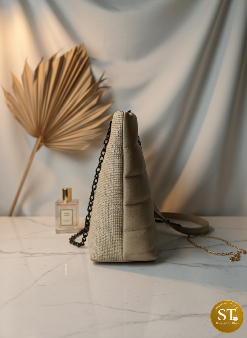 This elegant beige tote features a textured fabric front with smooth panel detailing and a clean, minimal back with a zip pocket. Finished with dual handles and chain-detailed slings, it blends everyday comfort with refined style.