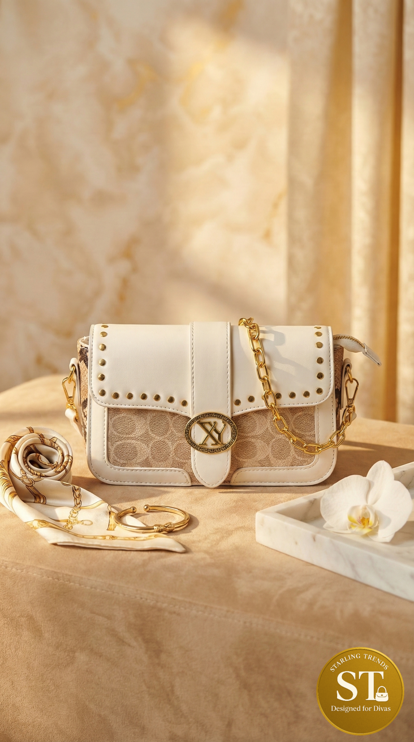 Elegant off-white sling bag with a textured finish and premium gold logo. The structured flap front adds a classy touch, while the back offers a clean, minimal look. Finished with a chic gold chain and leather shoulder strap for effortless everyday styling.