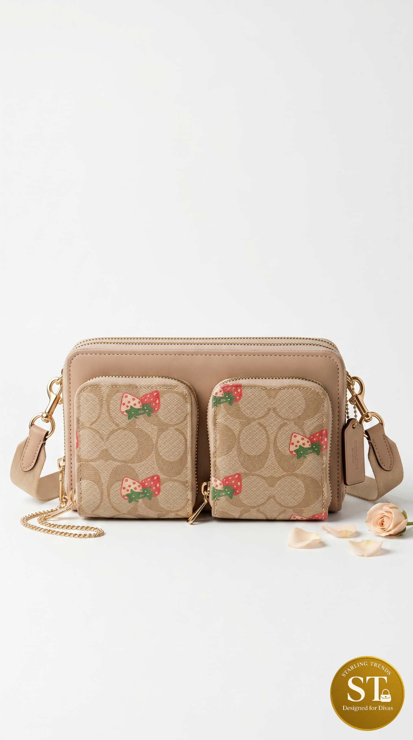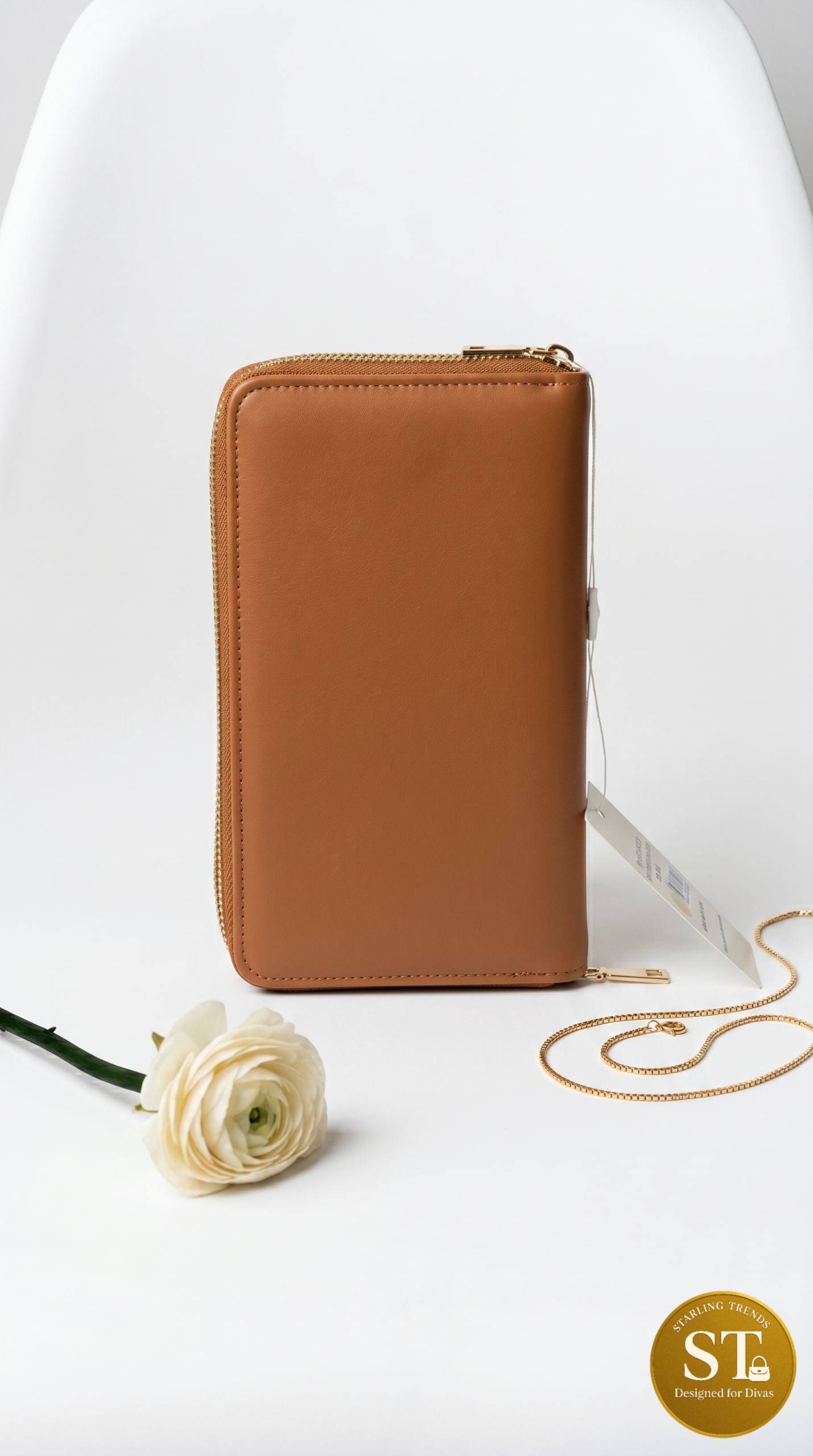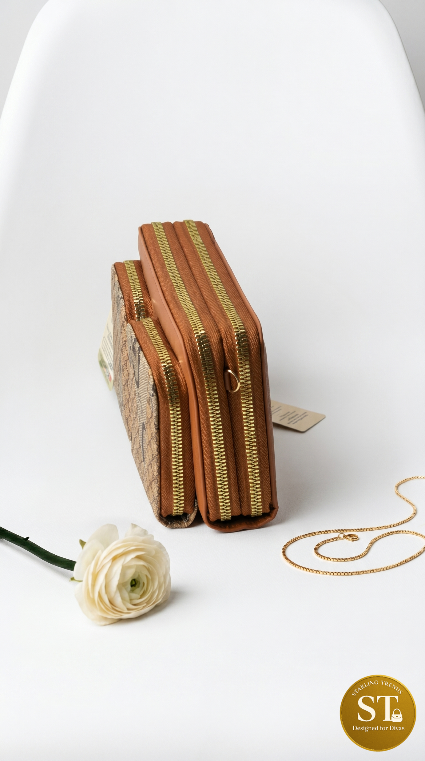 Chic tan wallet-clutch with premium leather finish and stylish printed front panels. Designed with dual zip compartments and a detachable sling, it blends elegance with everyday functionality—perfect for organizing essentials in style.