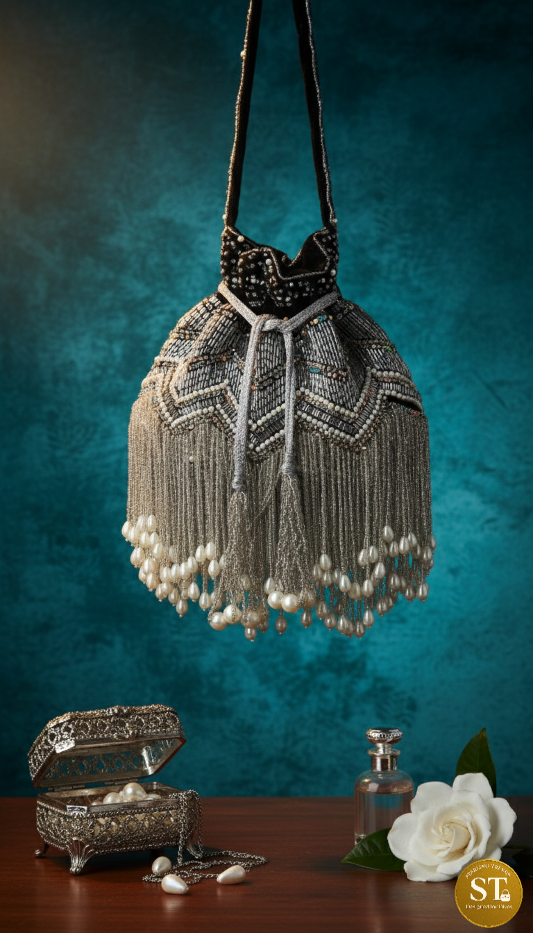 This handcrafted potli bag features intricate multicolor thread embroidery on a rich golden base. Finished with a pearl-beaded handle and drawstring closure, it adds festive elegance to ethnic and wedding looks. Front showcases detailed embroidery, back maintains the same rich pattern.