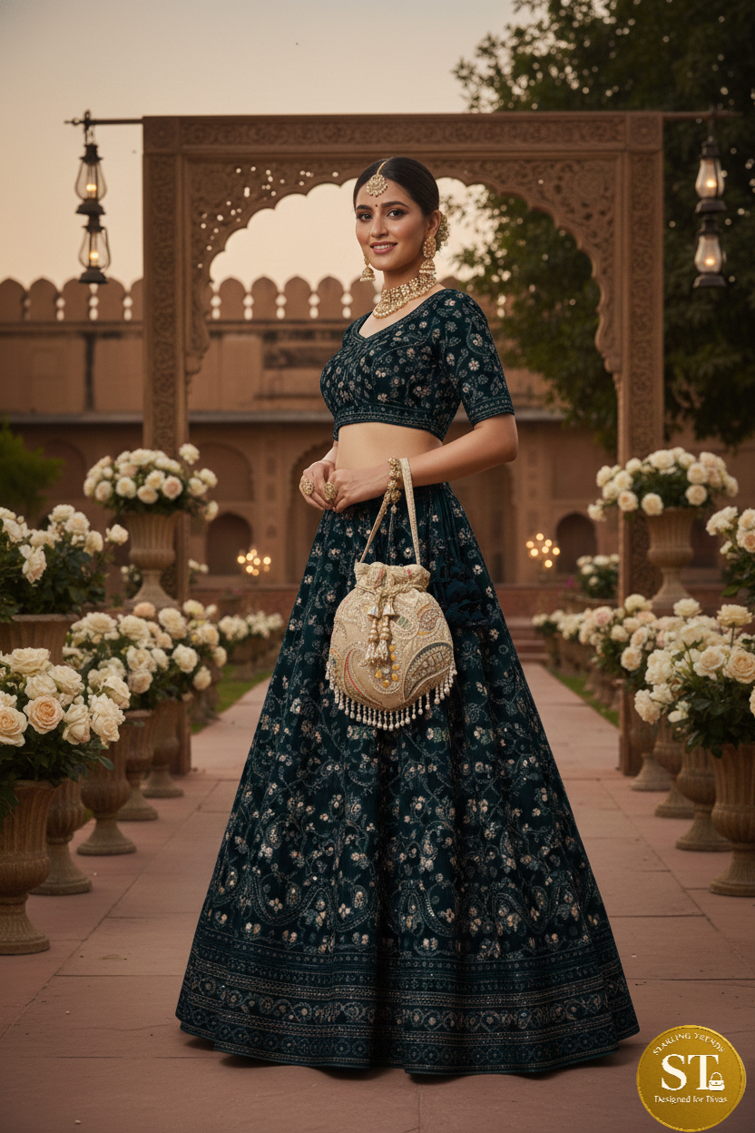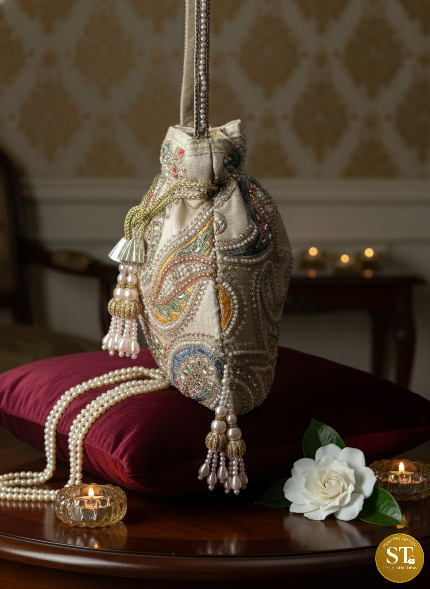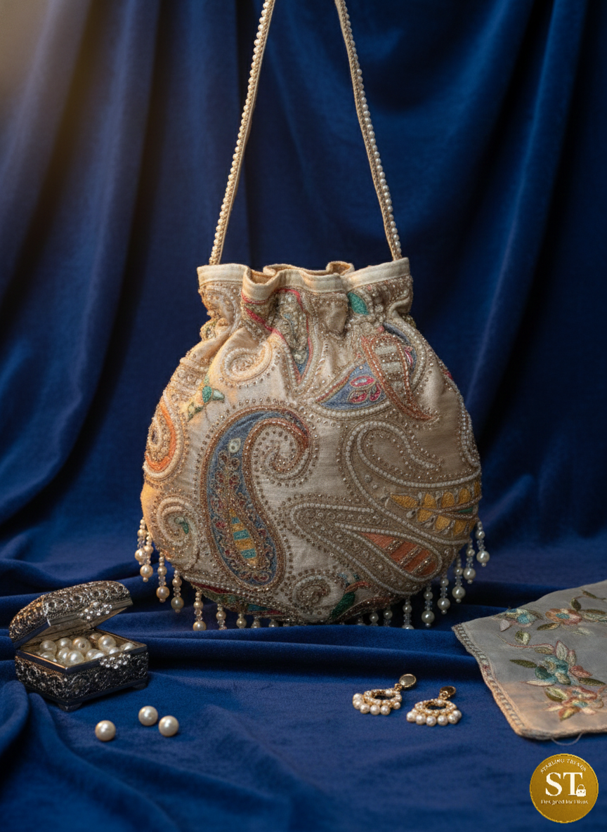 An elegant handcrafted potli sling featuring intricate paisley embroidery with fine beadwork and pearl fringes. The soft champagne base with pastel accents gives it a regal yet versatile appeal—perfect for weddings, festive events, and ethnic evenings.