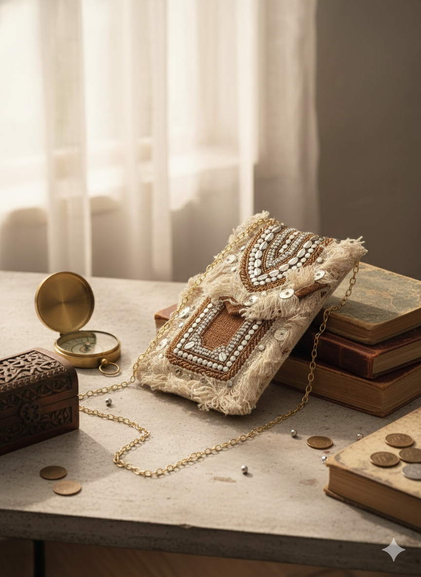 Elevate your festive look with this handcrafted pearl-beaded clutch featuring elegant pastel threadwork. The ivory base adorned with golden, pink, and green detailing adds timeless grace. Perfect for weddings and evening occasions, this lightweight piece comes with a matching beaded sling for easy carry.