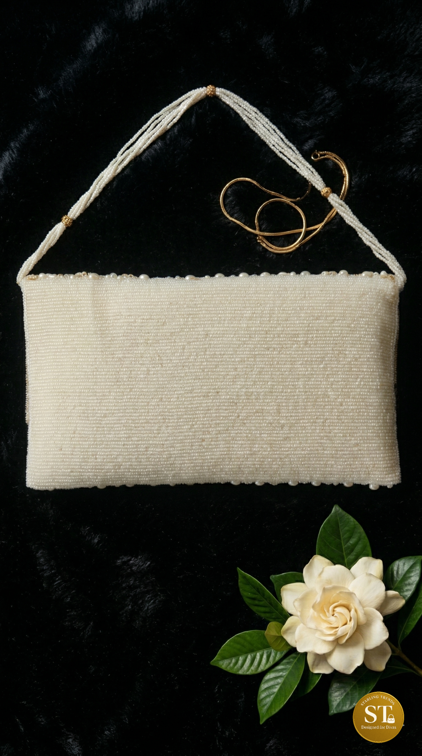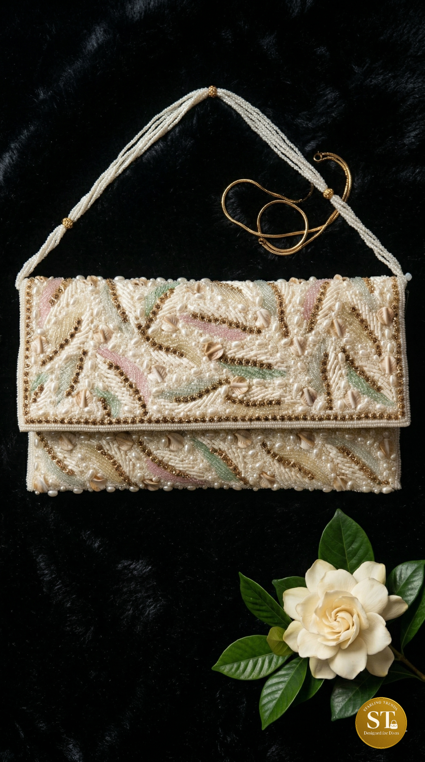 Elevate your festive look with this handcrafted pearl-beaded clutch featuring elegant pastel threadwork. The ivory base adorned with golden, pink, and green detailing adds timeless grace. Perfect for weddings and evening occasions, this lightweight piece comes with a matching beaded sling for easy carry.