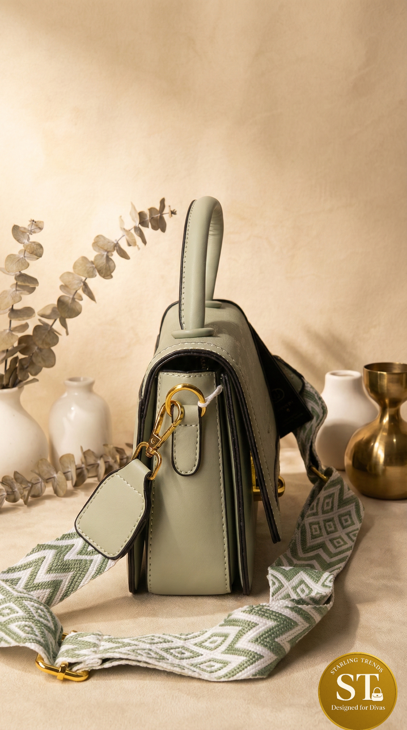 Elegant sage green structured sling bag with textured flap detailing and smooth back panel. Finished with a top handle, gold-tone hardware, and a wide patterned adjustable sling for stylish everyday carry.