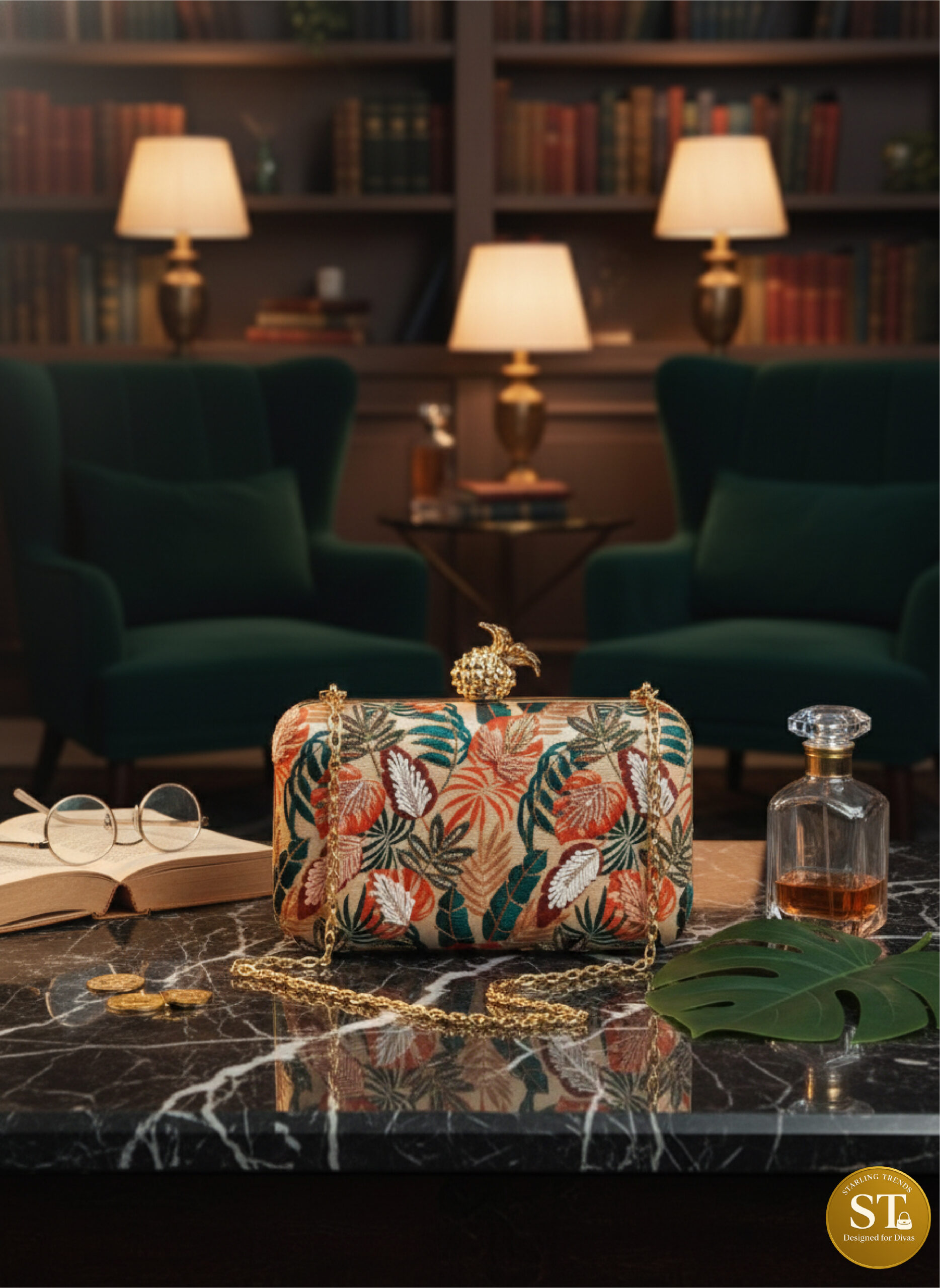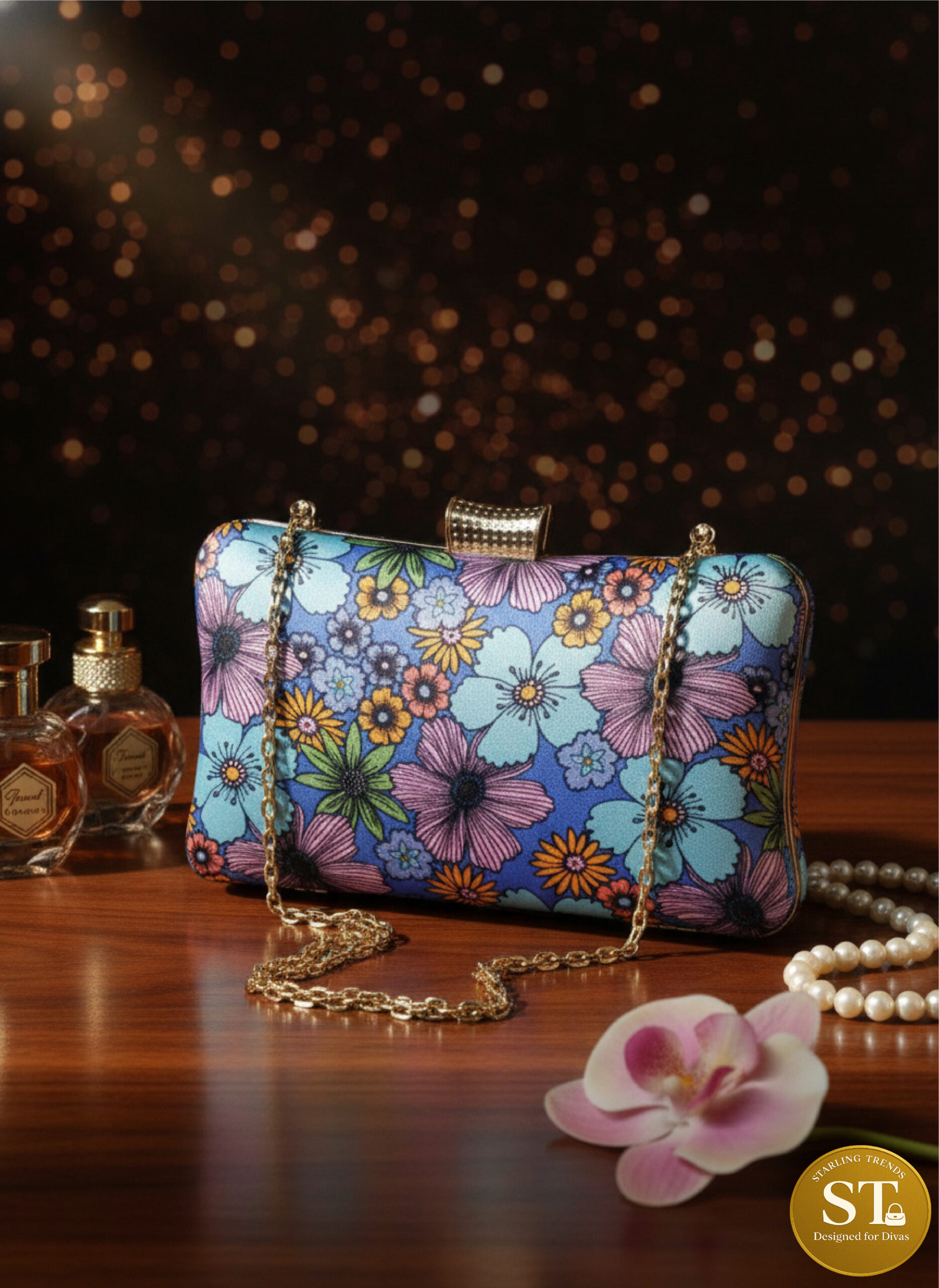 A mesmerizing clutch adorned with intricate floral embroidery in rich hues of blue, purple, and orange, set against a sophisticated base. Embellished with beads and rhinestones, it flaunts a jeweled clasp and a detachable golden chain sling—radiating elegance with every carry.