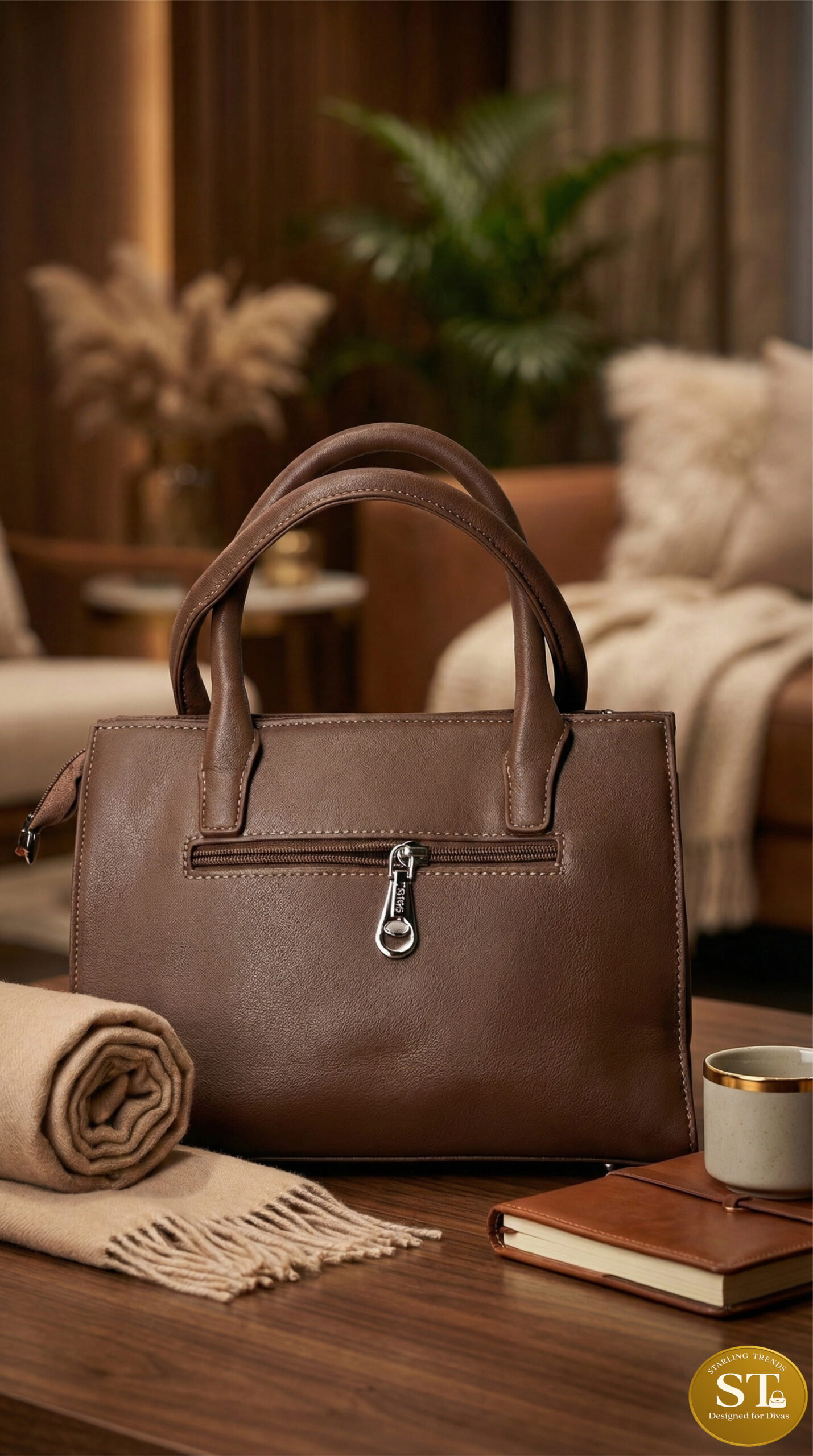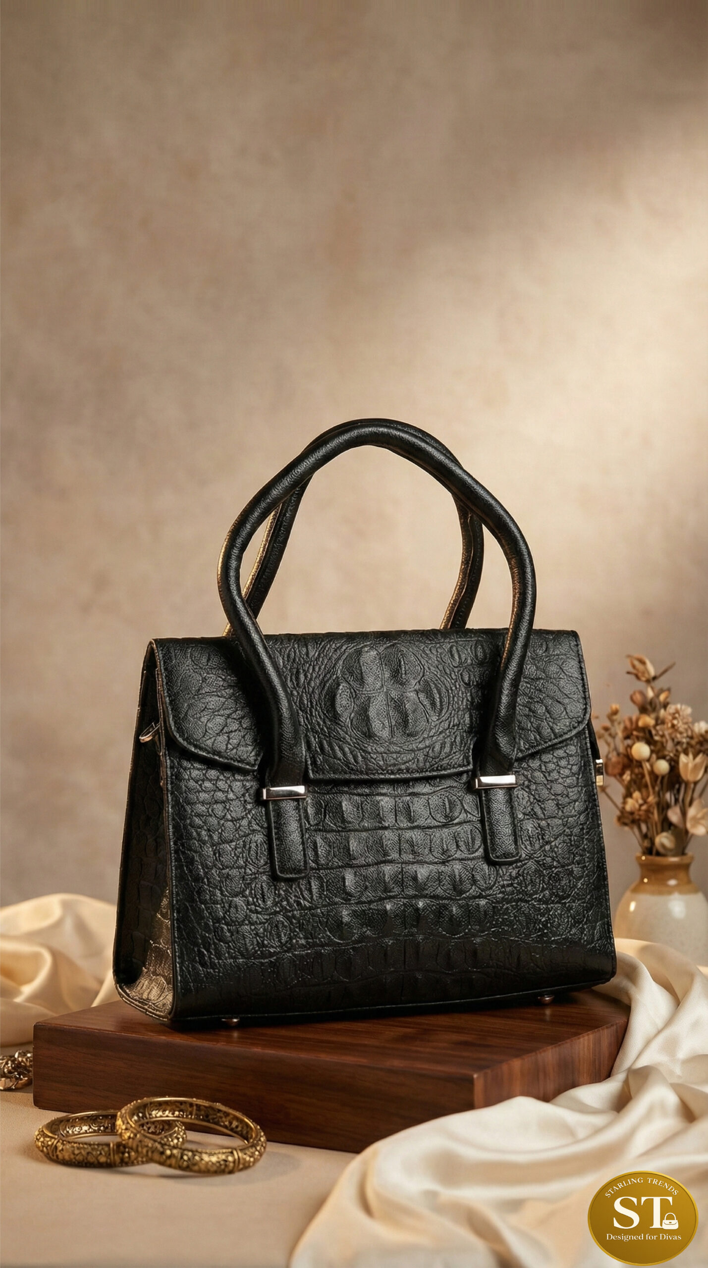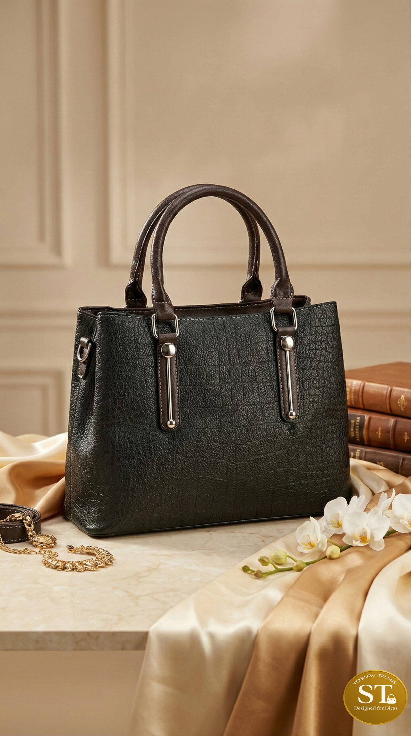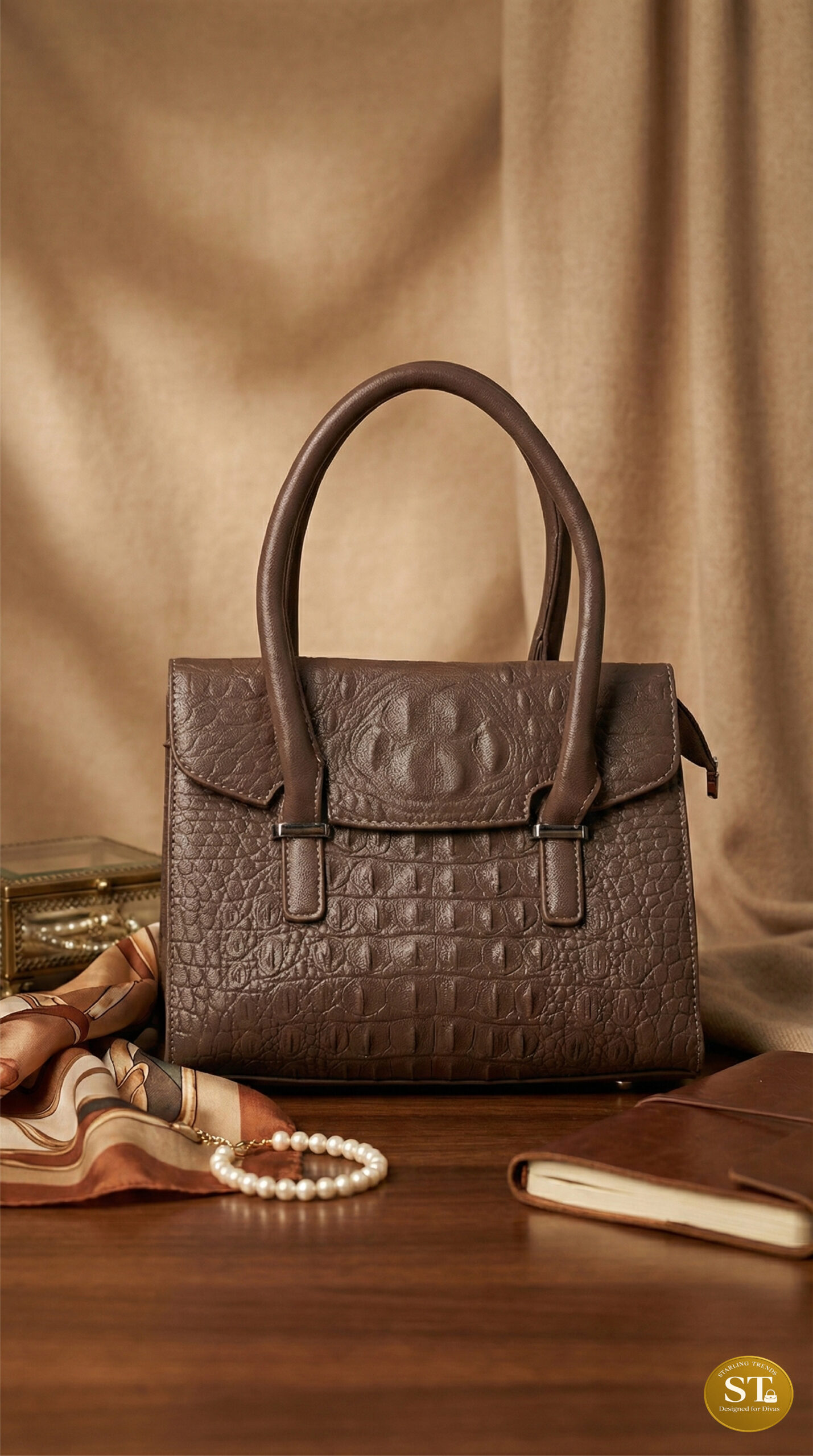 Elegant brown textured handbag featuring premium croc-pattern work on the front and a smooth finish at the back. Comes with sturdy dual handles and an adjustable sling for versatile styling. A perfect blend of structure, style, and everyday convenience.