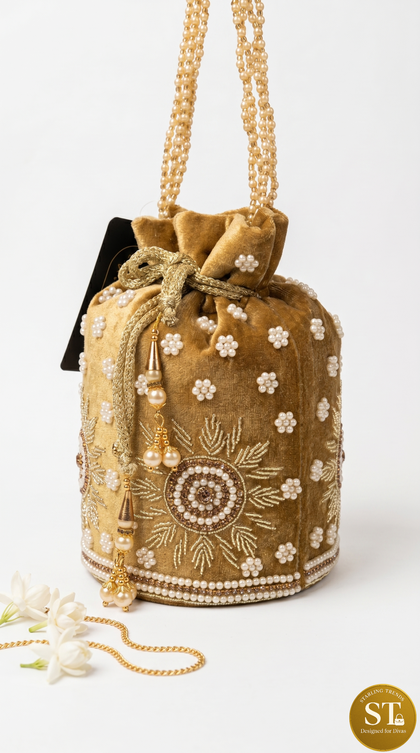 This elegant emerald green potli bag features intricate golden bead and sequin embroidery in a leaf pattern, giving it a rich festive look. The stylish golden bead handle and decorative tassels add charm, making it perfect for weddings, parties, and traditional occasions.