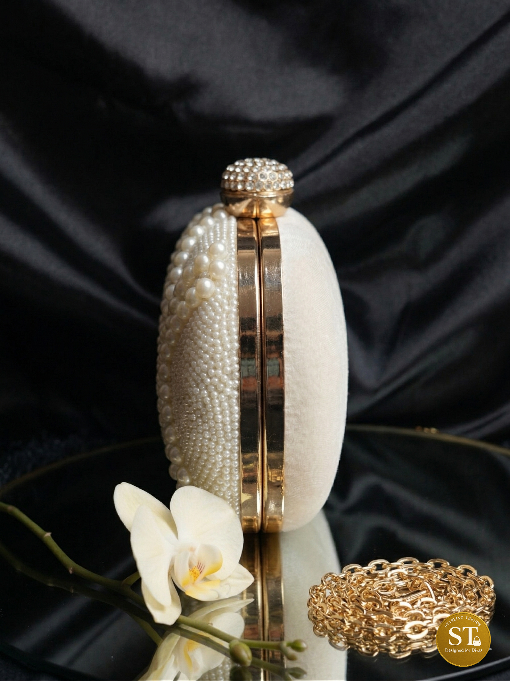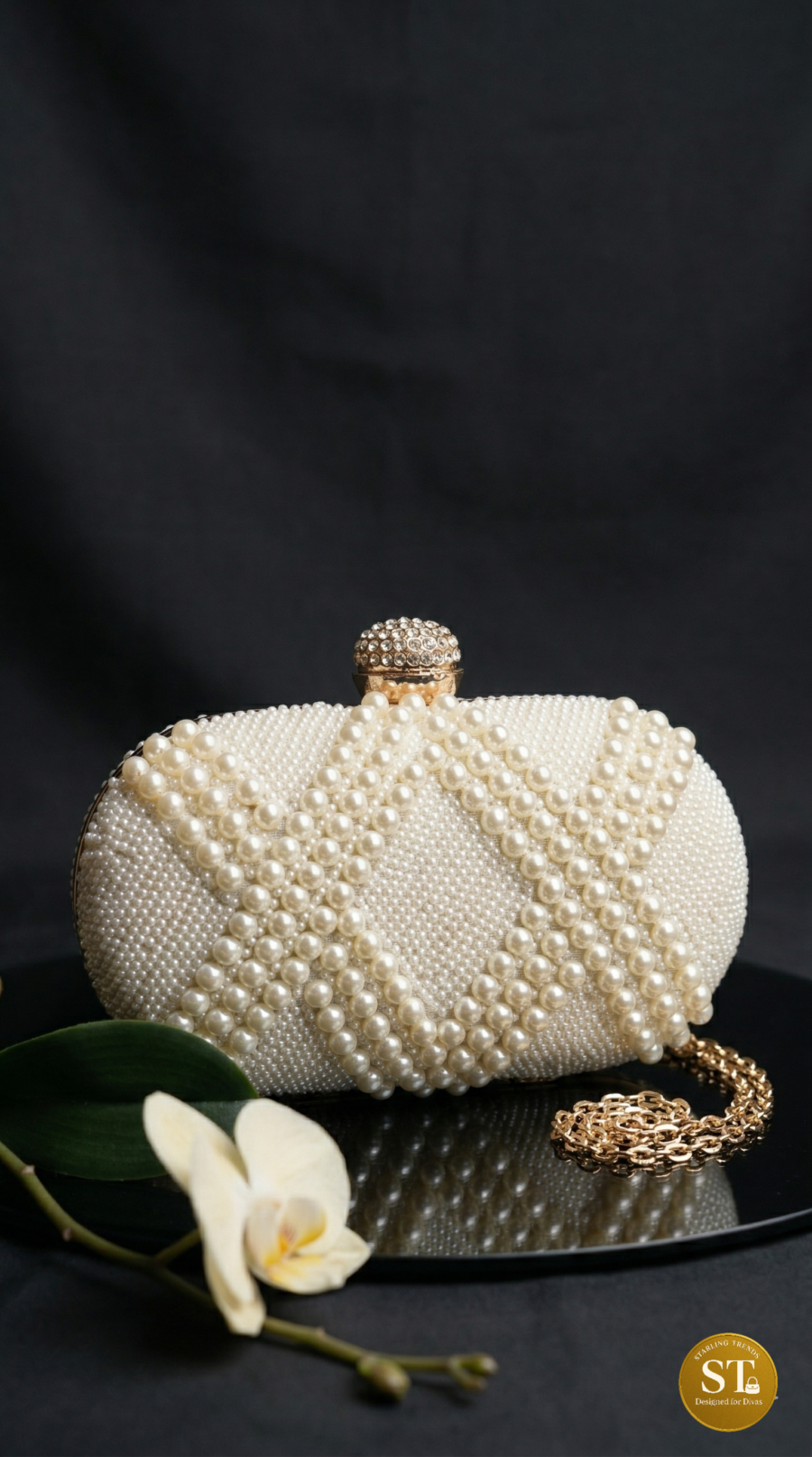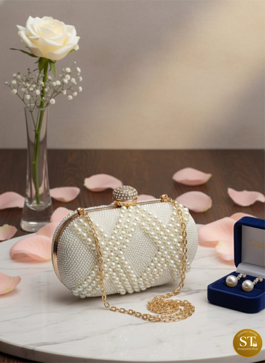 A pearl-studded clutch that whispers vintage elegance—featuring a diamond beadwork pattern over an oval silhouette, crowned with a rhinestone-encrusted clasp. With its detachable golden chain sling, it’s a blend of timeless luxury and modern ease.