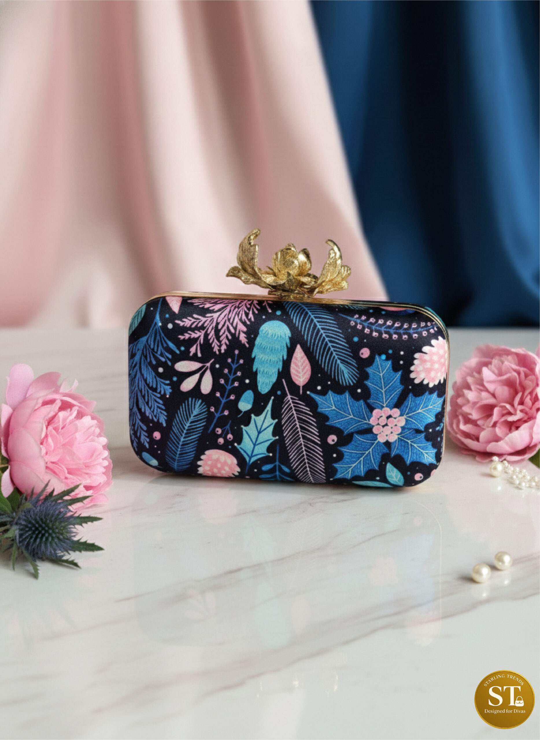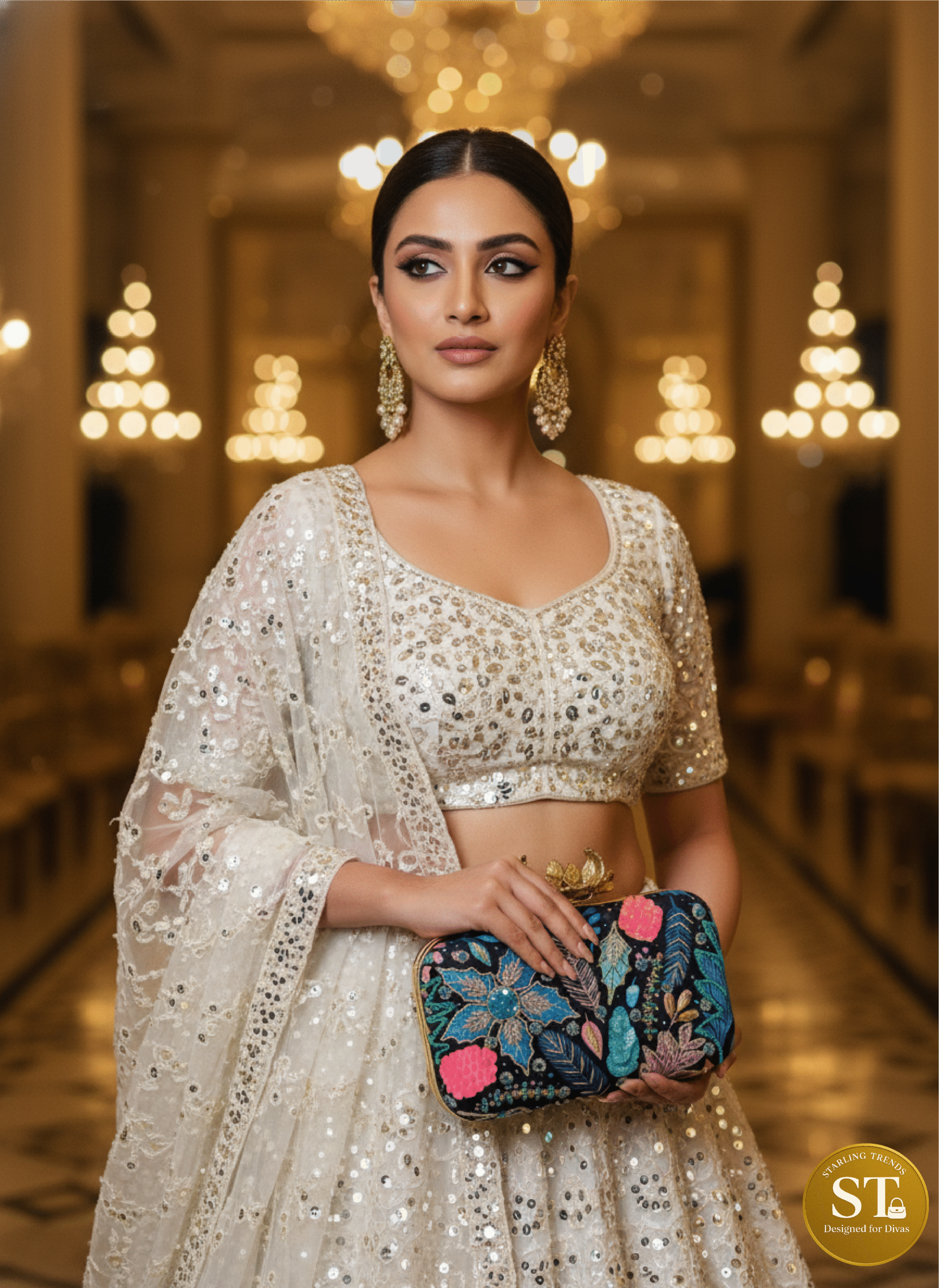 A captivating clutch that blends vibrance with tradition—featuring multicolored floral embroidery on luxe black fabric, sparkling sequin details, and a golden flower clasp. Paired with a golden chain sling, it’s elegance reimagined for effortless festive charm.