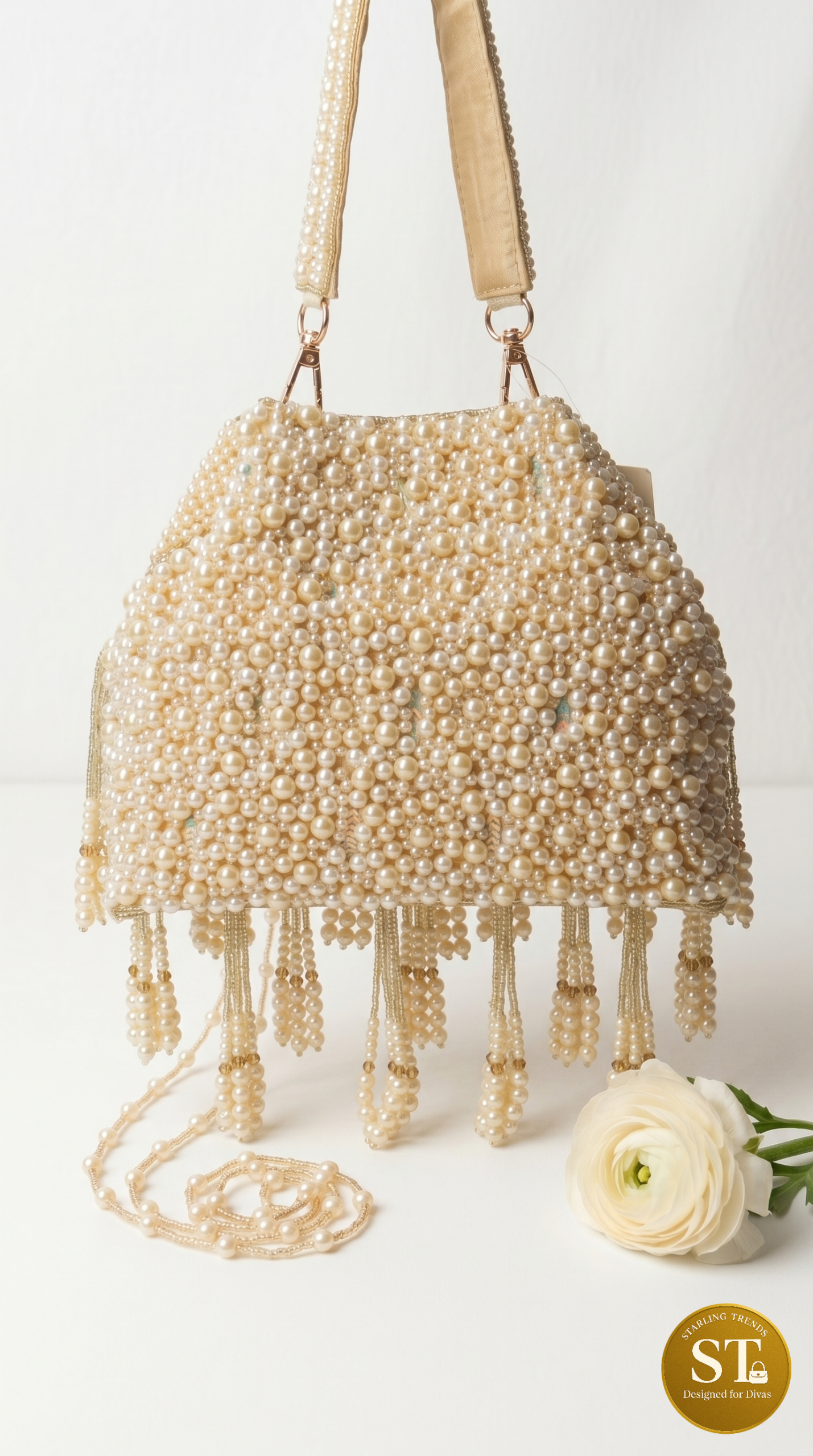 Elegant ivory pearl potli-style bag adorned with dense hand-beaded work and cascading pearl tassels. Features a structured silhouette with a soft satin base and a matching pearl-embellished sling, perfect for weddings, festive occasions, and statement styling.