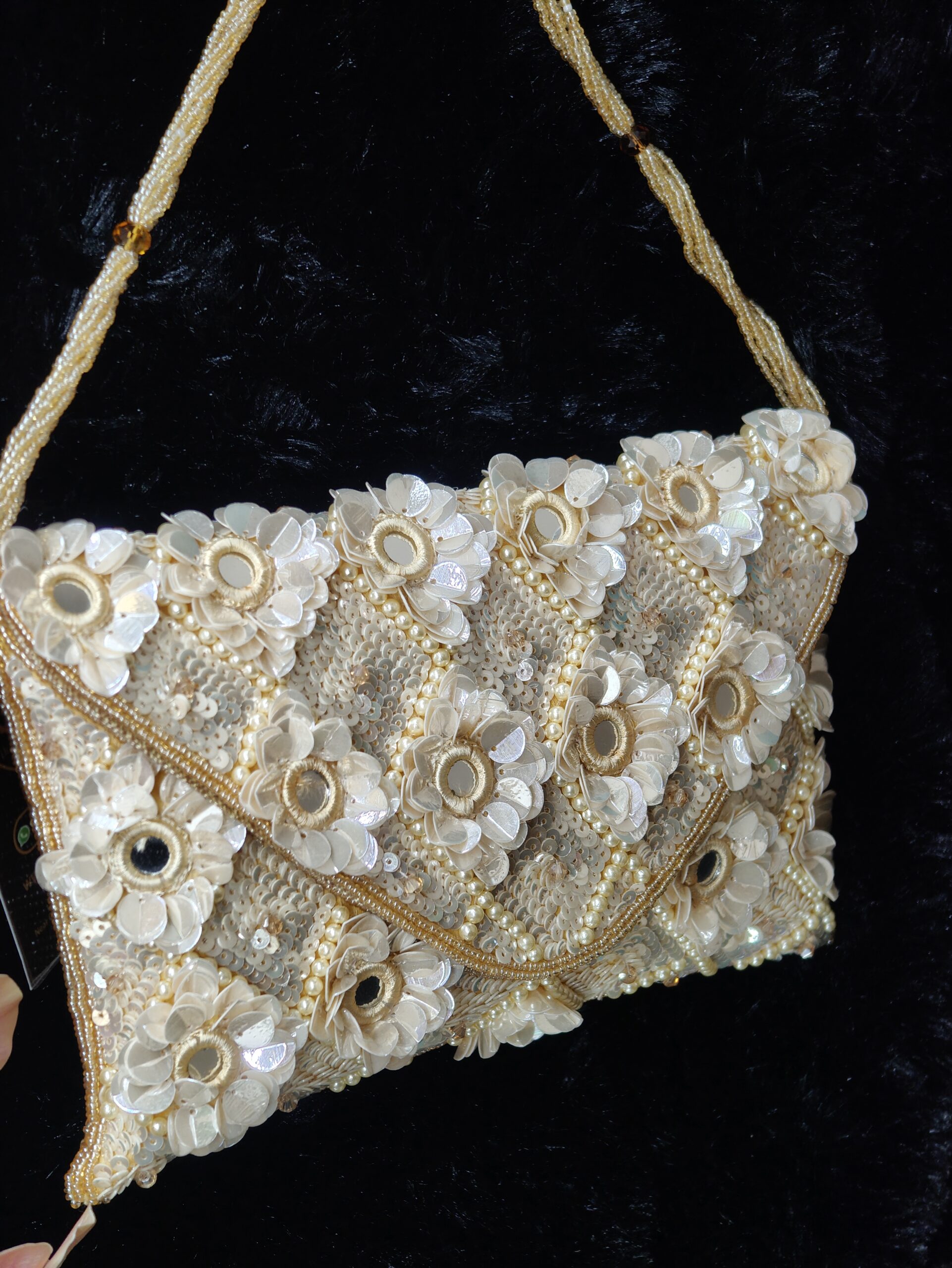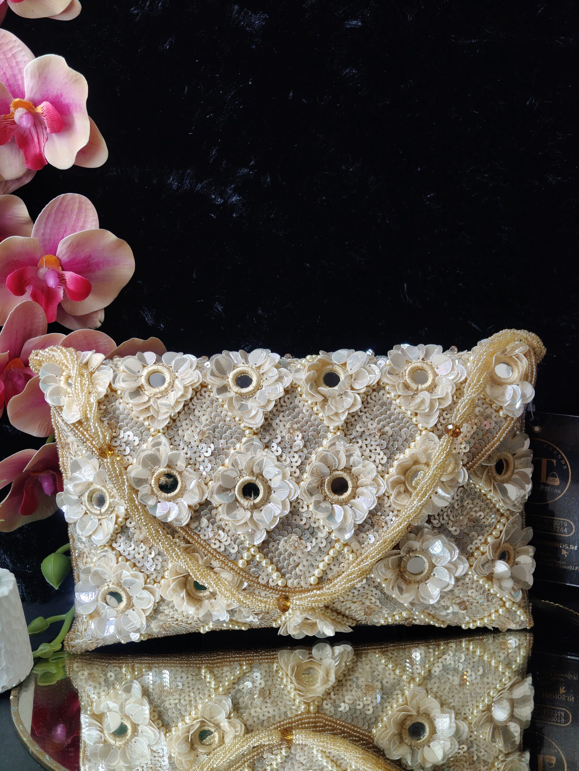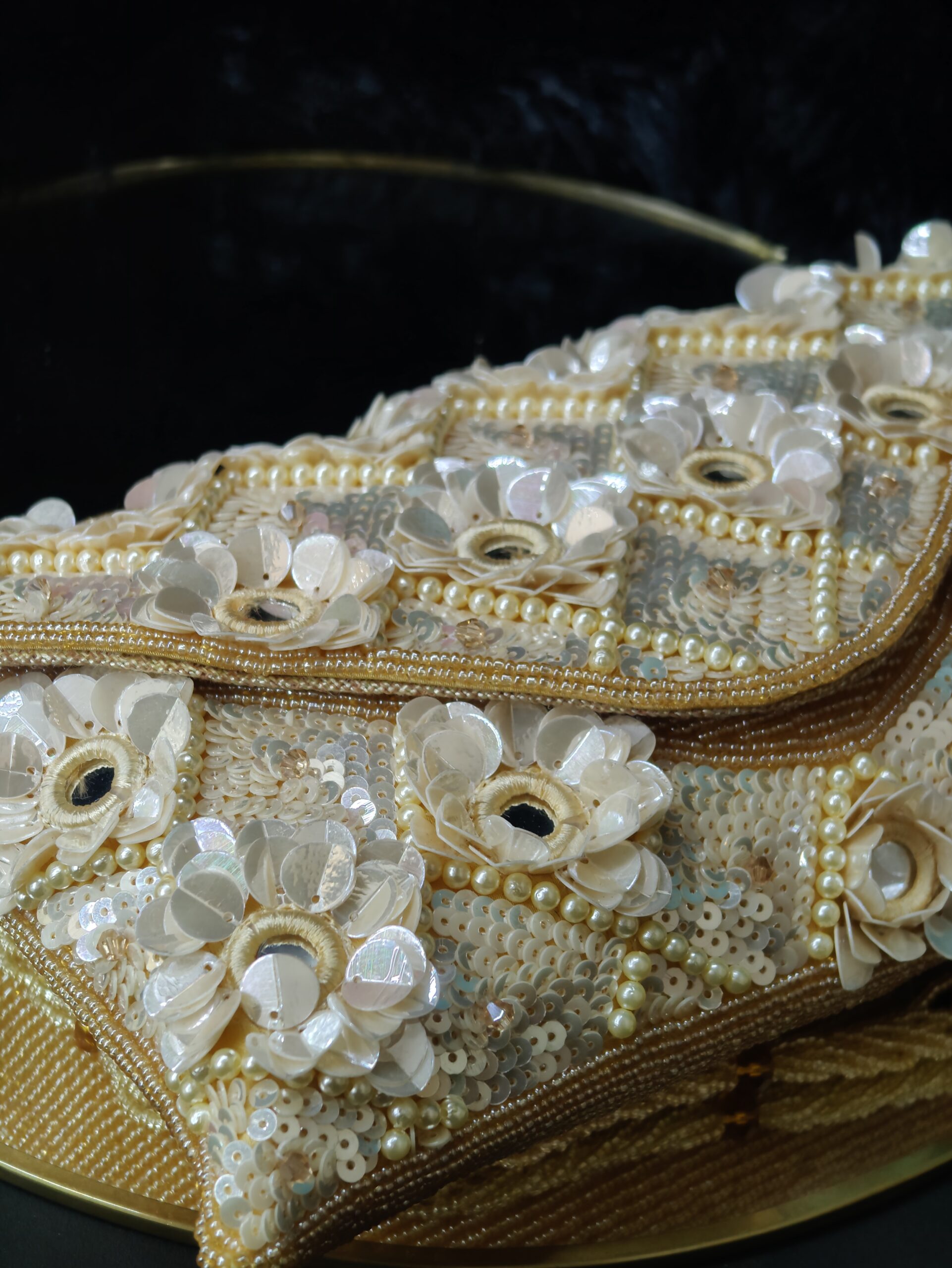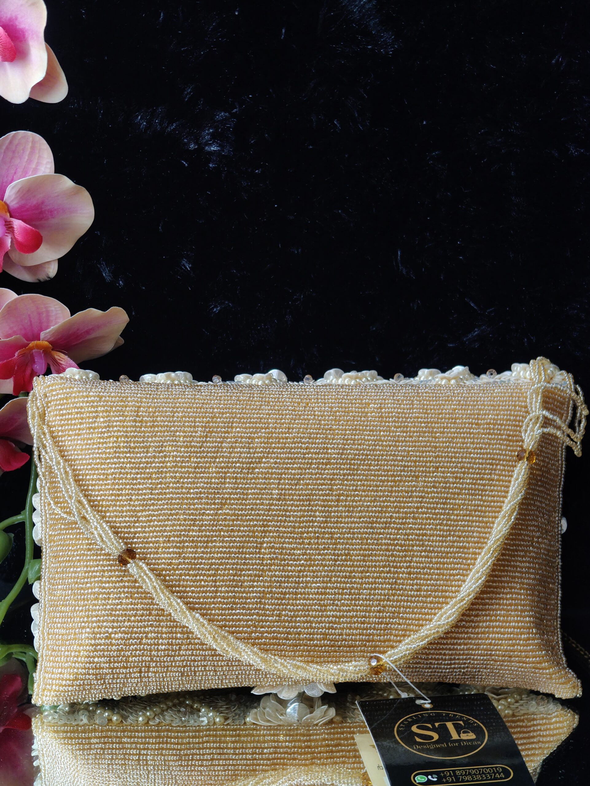 This elegant handcrafted clutch features intricate floral sequin and bead embroidery in a rich champagne-gold tone. Perfect for festive and wedding occasions, it comes with a twisted beaded sling for versatile styling — carry it as a clutch or shoulder bag.