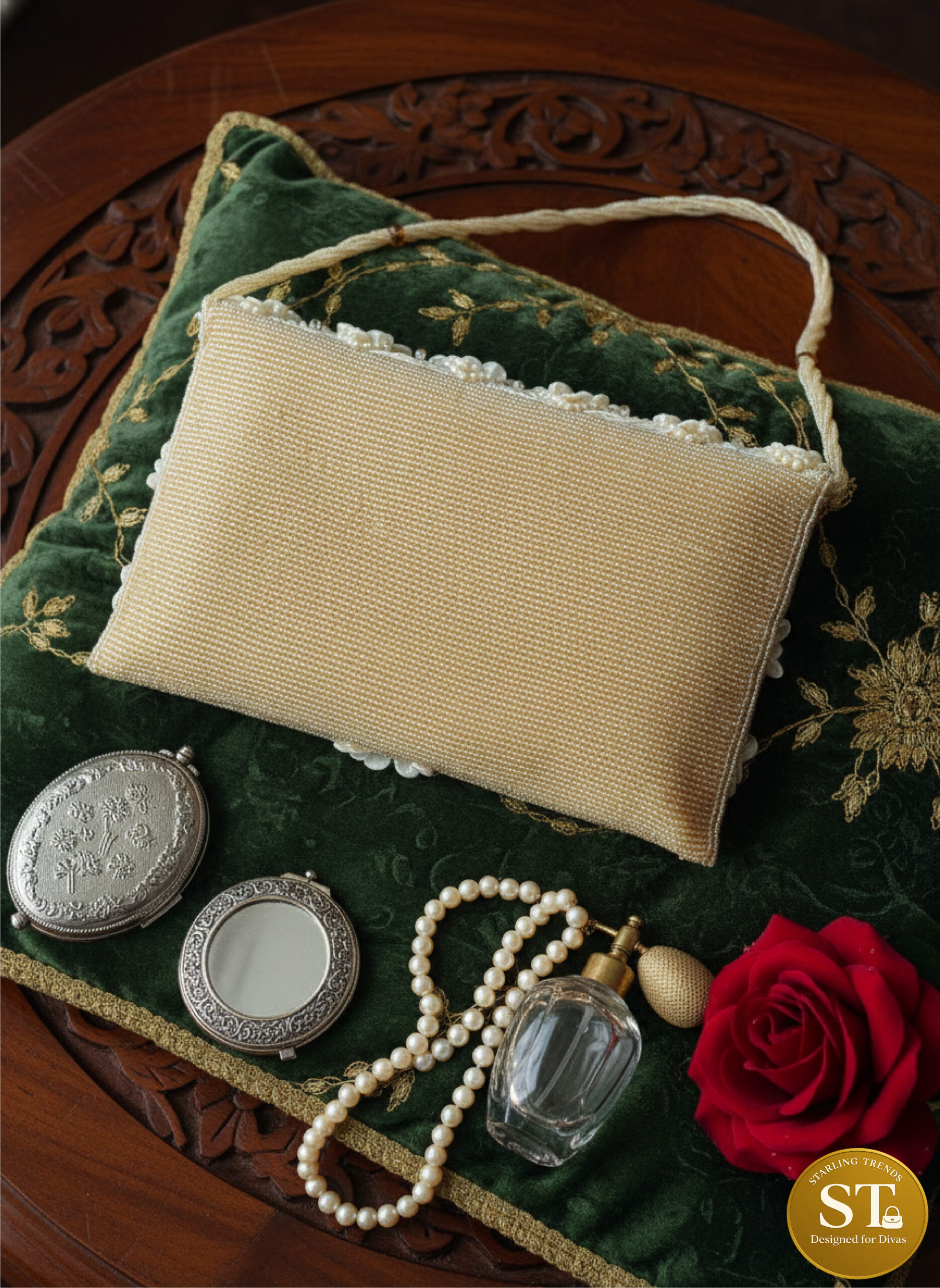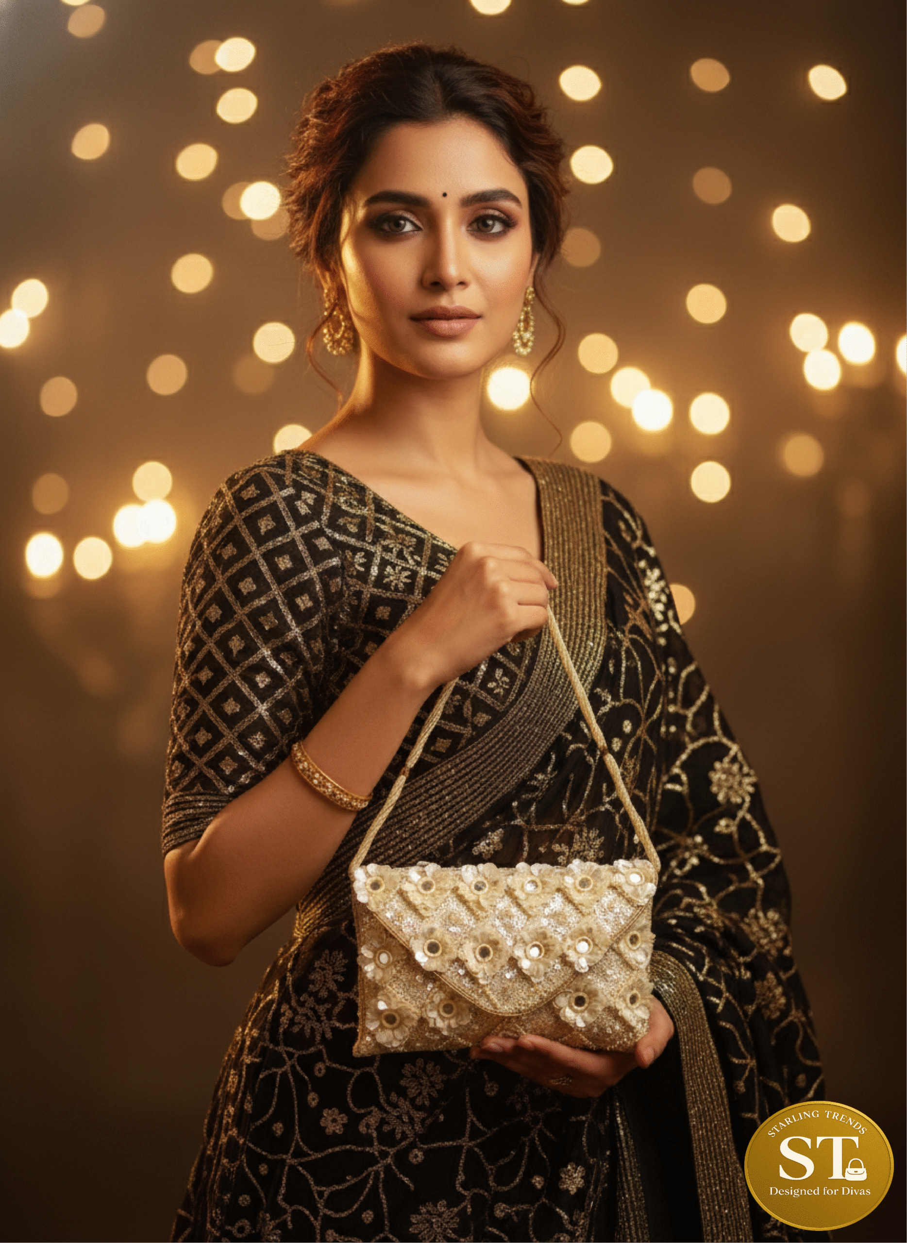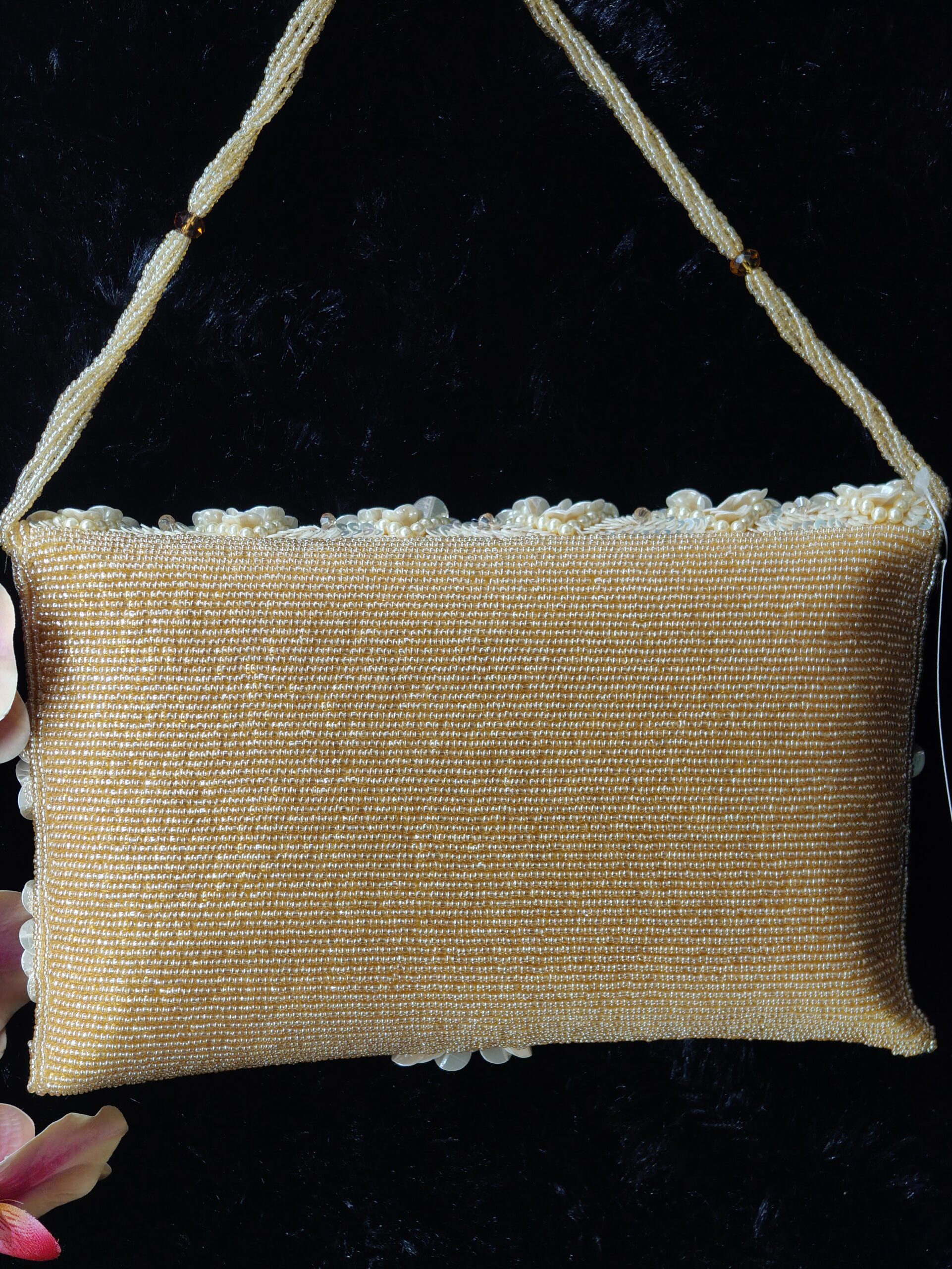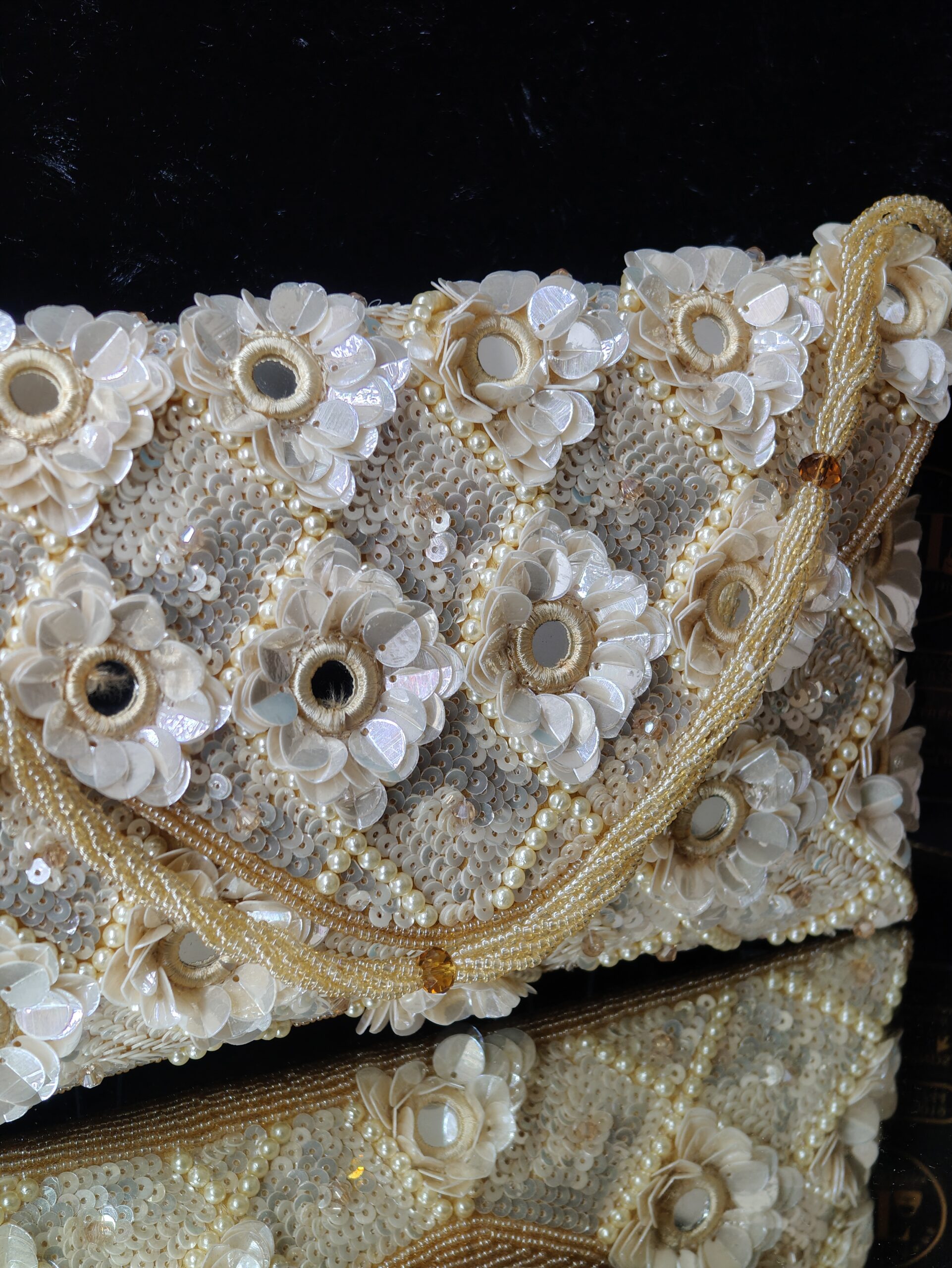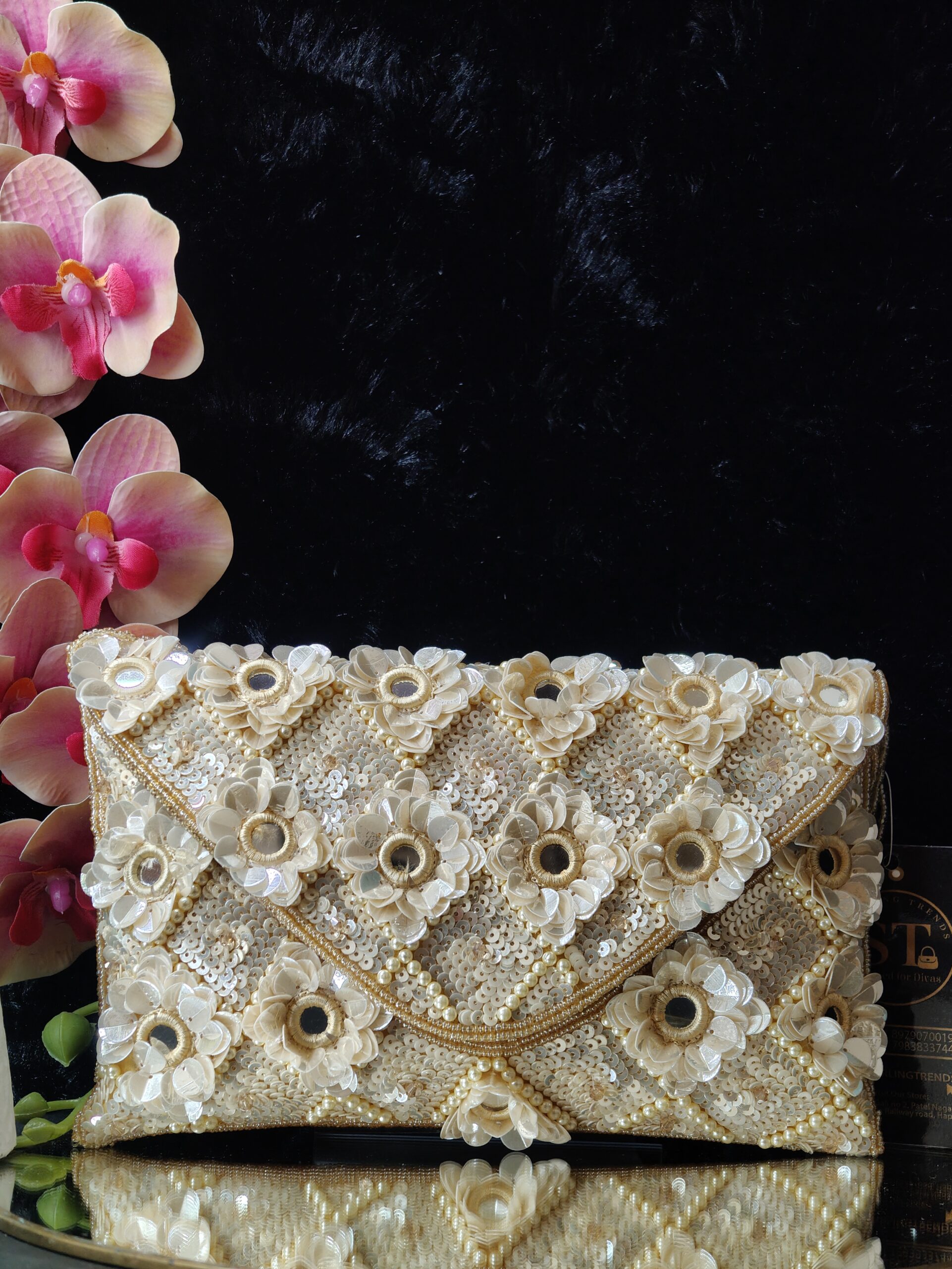 This elegant handcrafted clutch features intricate floral sequin and bead embroidery in a rich champagne-gold tone. Perfect for festive and wedding occasions, it comes with a twisted beaded sling for versatile styling — carry it as a clutch or shoulder bag.