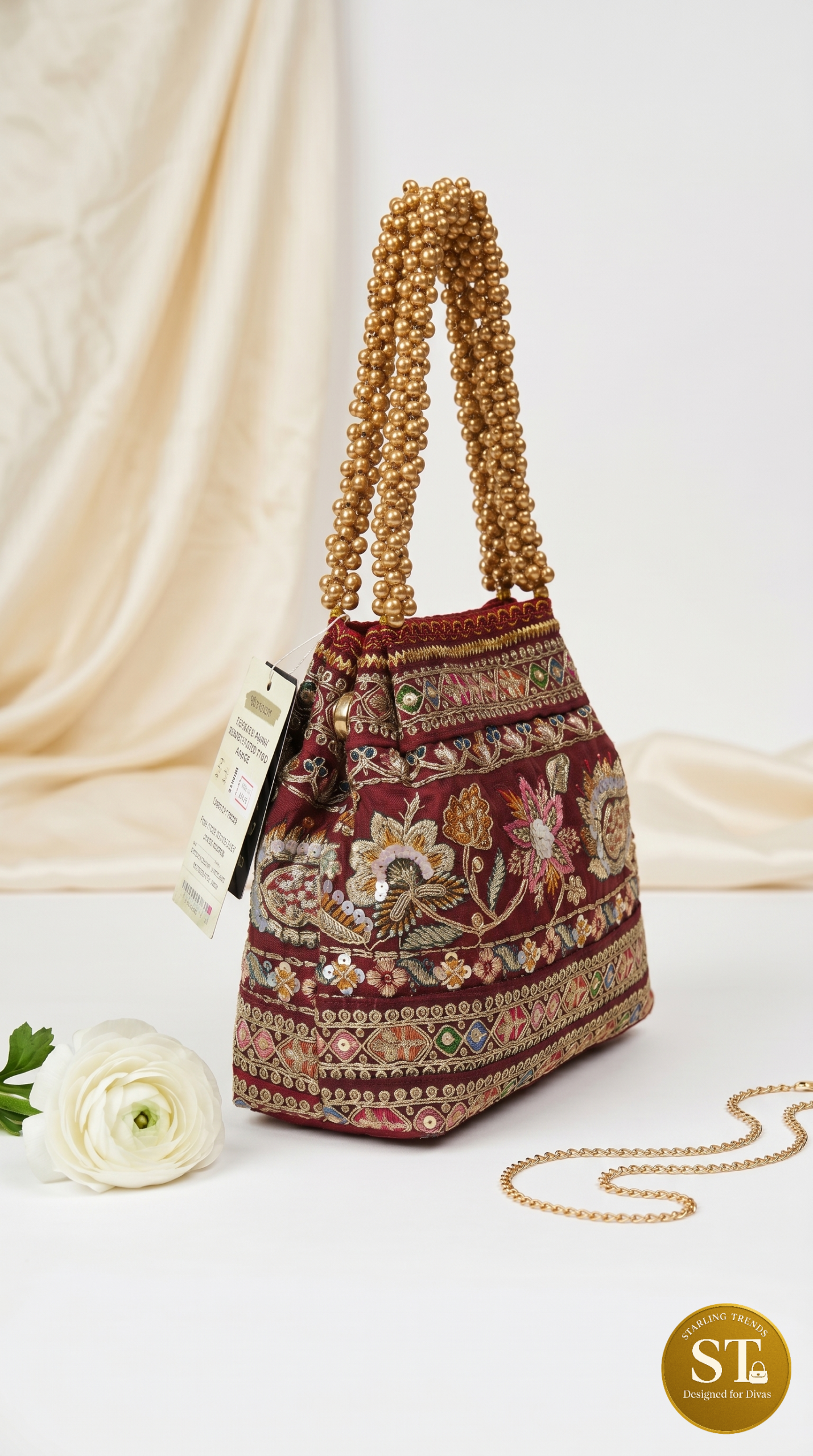 Elegant maroon potli-style handbag adorned with intricate multicolor floral embroidery, sequins, and zari detailing. The rich golden bead handle adds a festive charm, making it perfect for weddings and ethnic occasions. Compact yet eye-catching, it blends tradition with statement style.