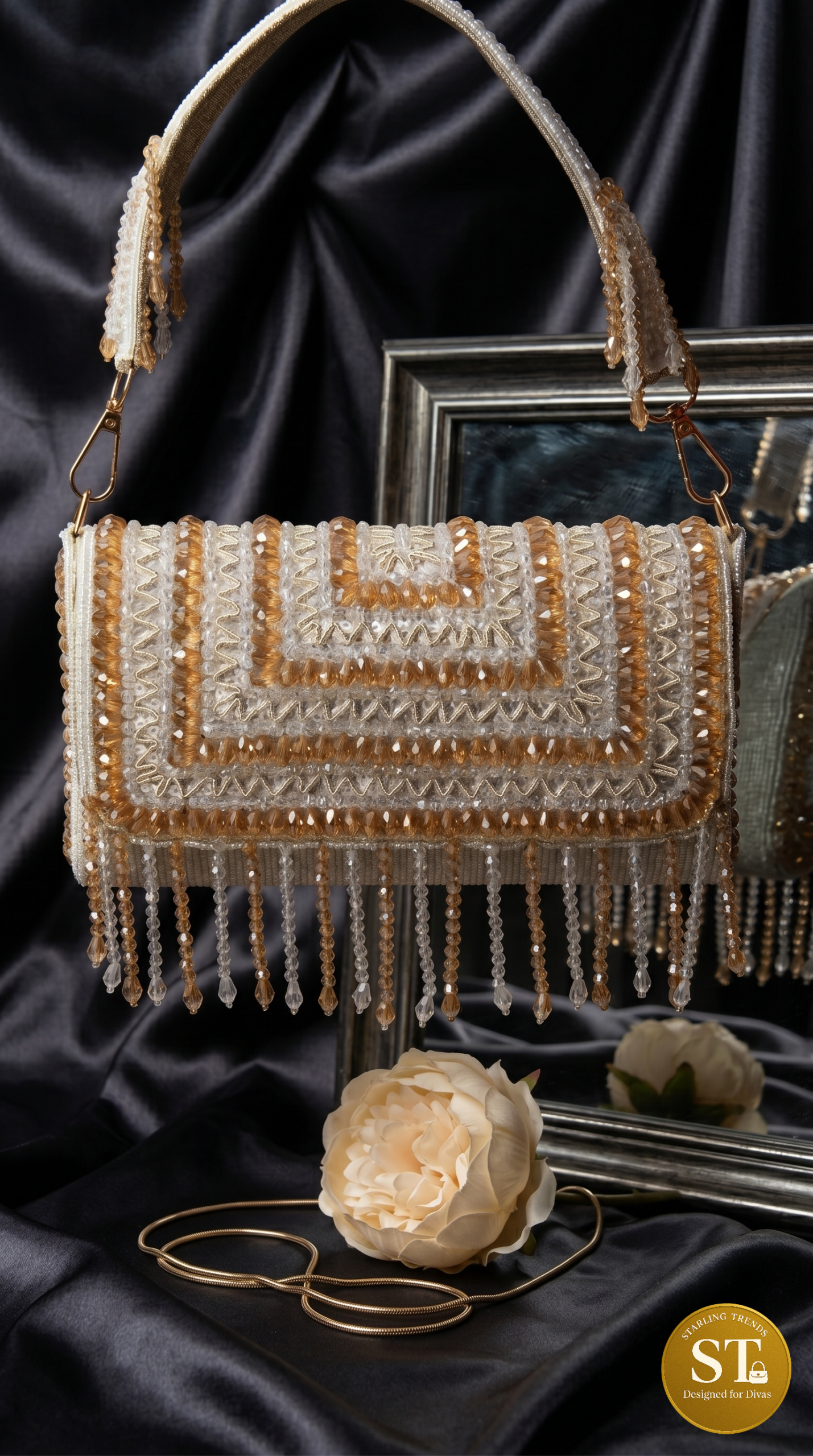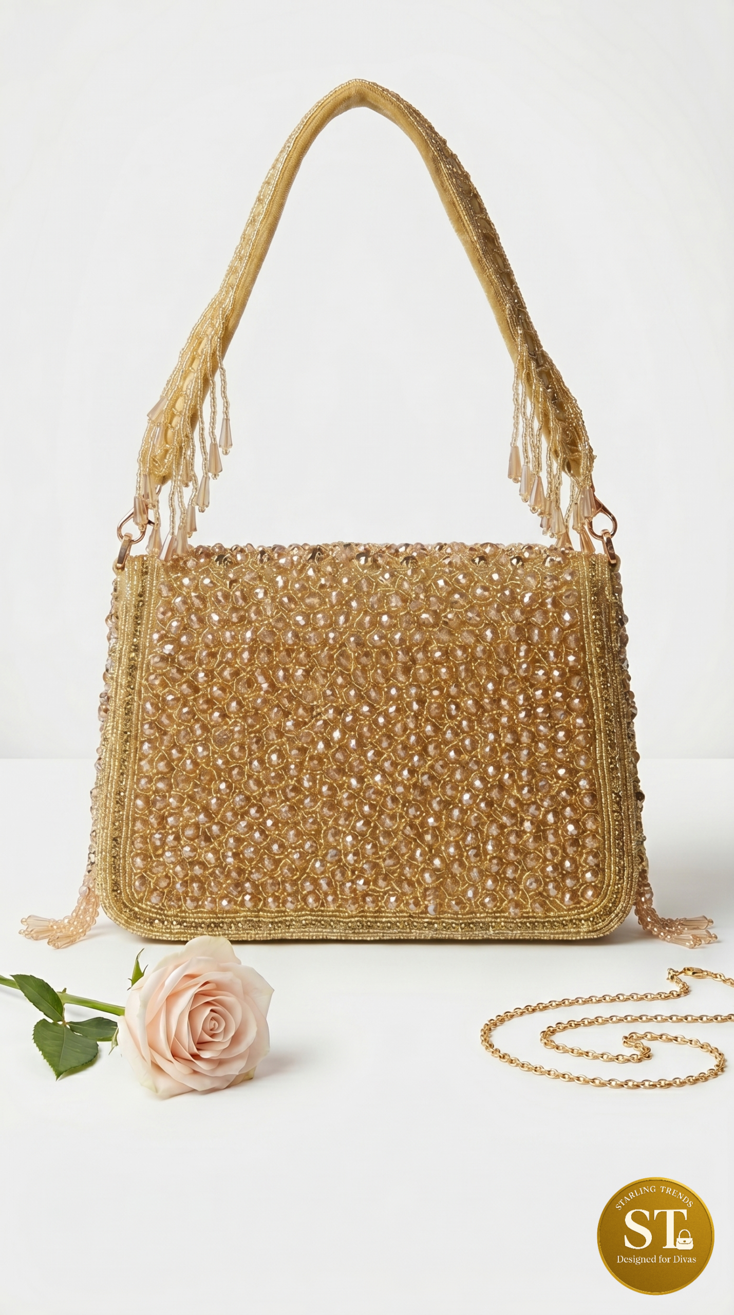 A luxurious golden embellished clutch featuring intricate handwork with shimmering stones and bead detailing in floral burst patterns. The soft fabric sling with hanging bead tassels adds elegance, making it perfect for weddings, festive occasions, and evening glam looks.