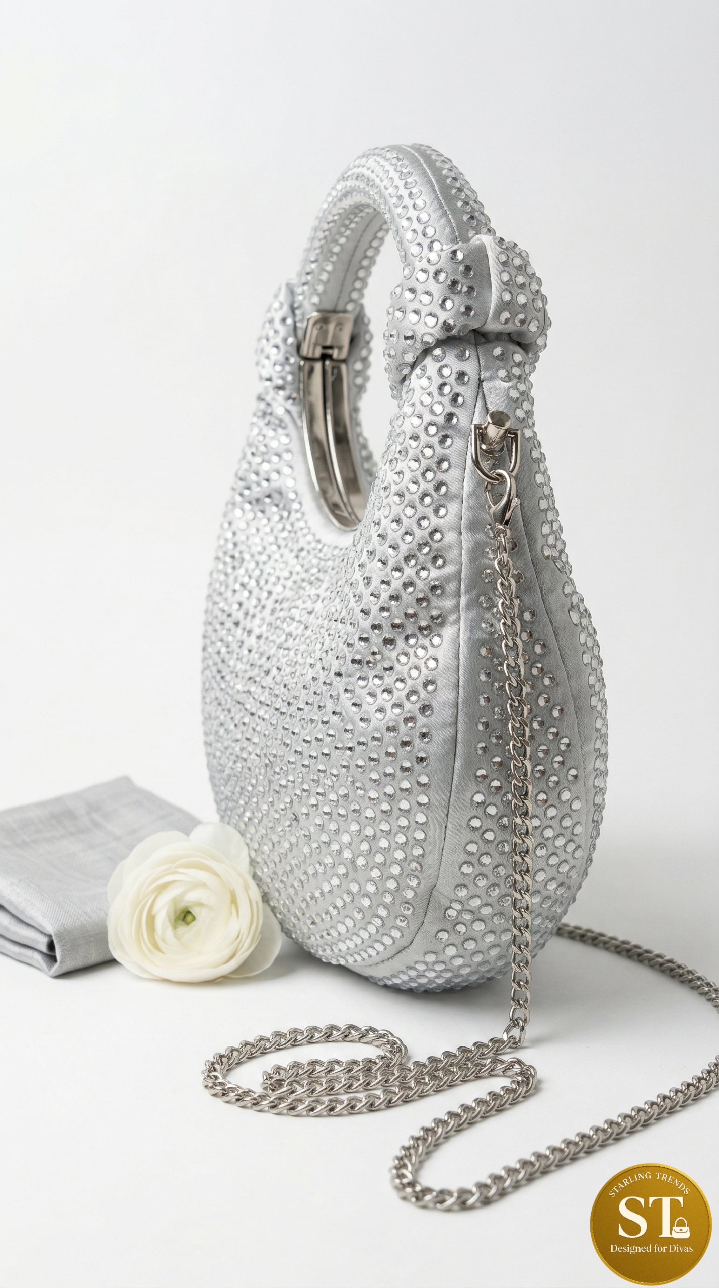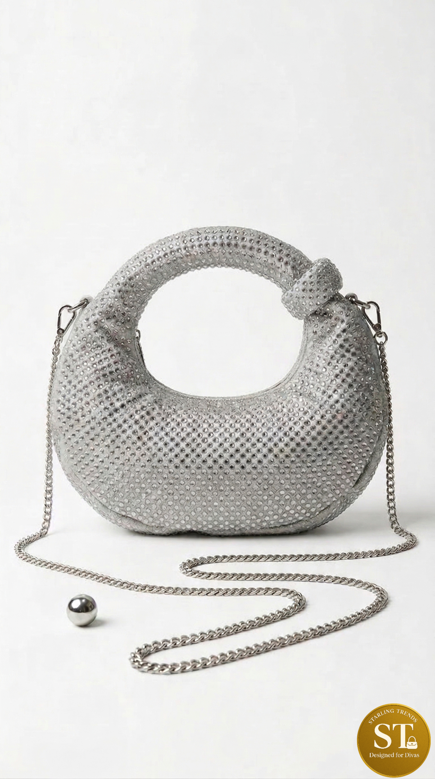 This elegant silver shoulder bag features all-over crystal stud work with a chic crescent shape. The front showcases dense shimmer detailing, while the back maintains a clean, structured finish. Comes with a detachable chain sling for versatile styling.