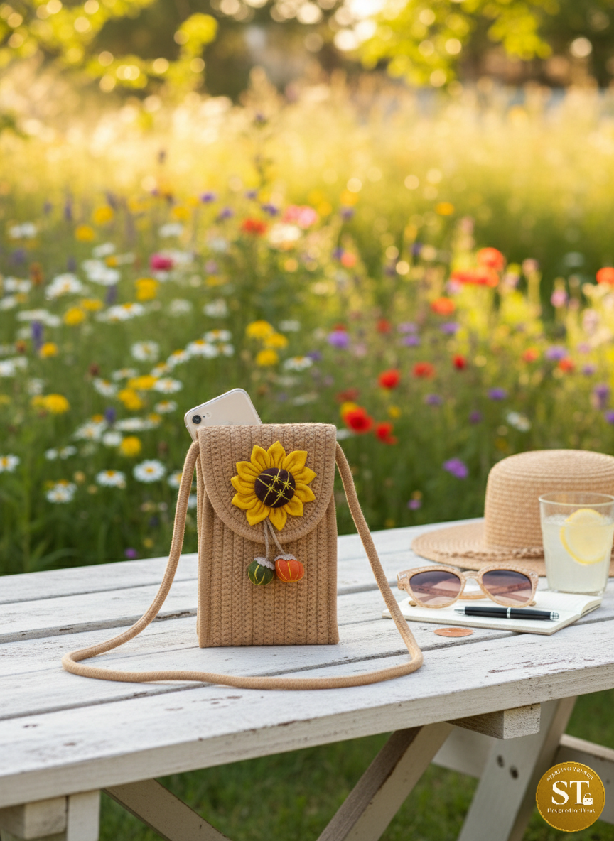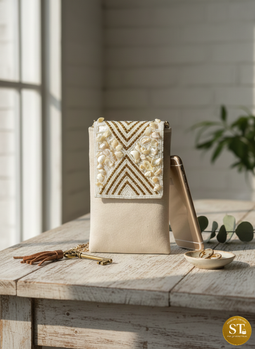 A handcrafted phone sling designed for everyday ease. Featuring detailed handwork on the front , this piece blends style with utility—perfect for hands-free outings, travel, or casual days.