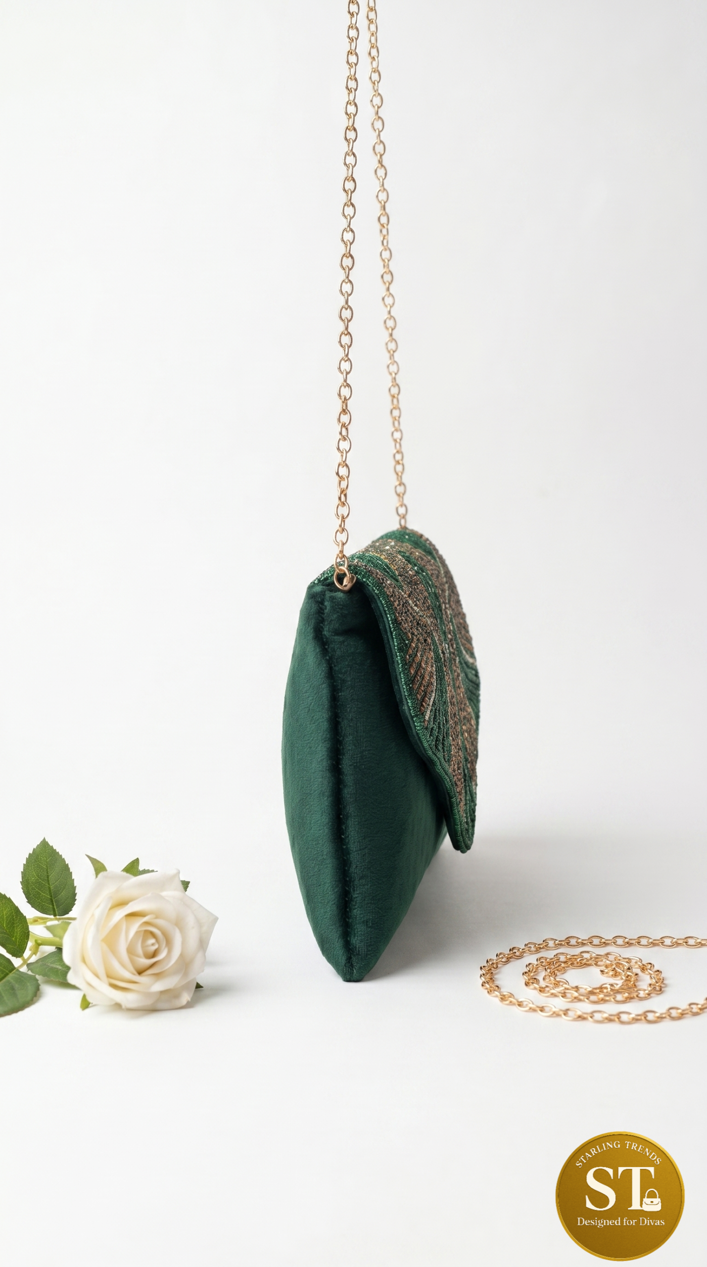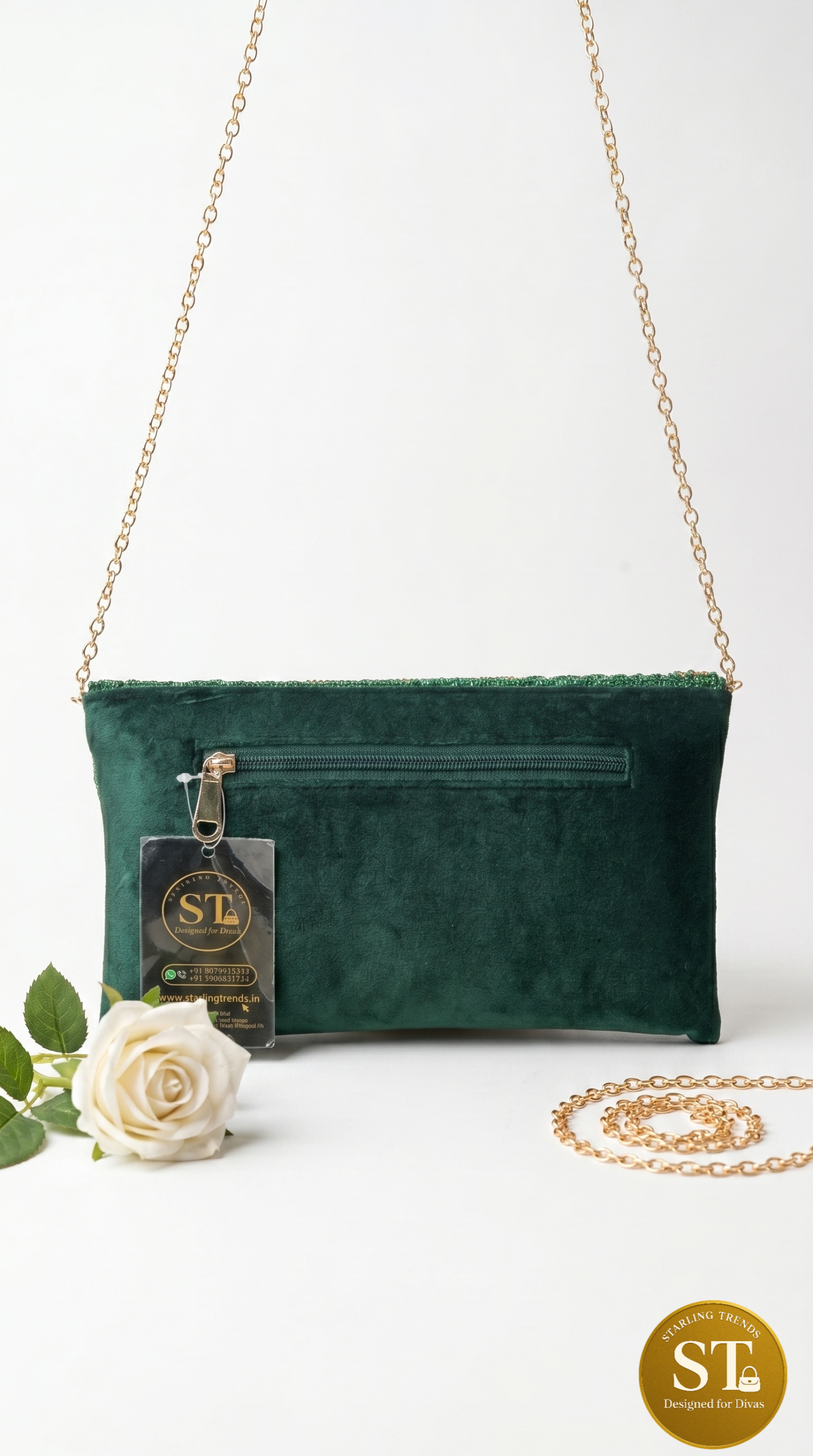 Elegant emerald green flap with intricate bead, sequin, and zari embroidery in a symmetrical artistic pattern. Premium suede-like finish with a sleek gold chain sling adds a festive yet classy touch—perfect for weddings and evening outings.